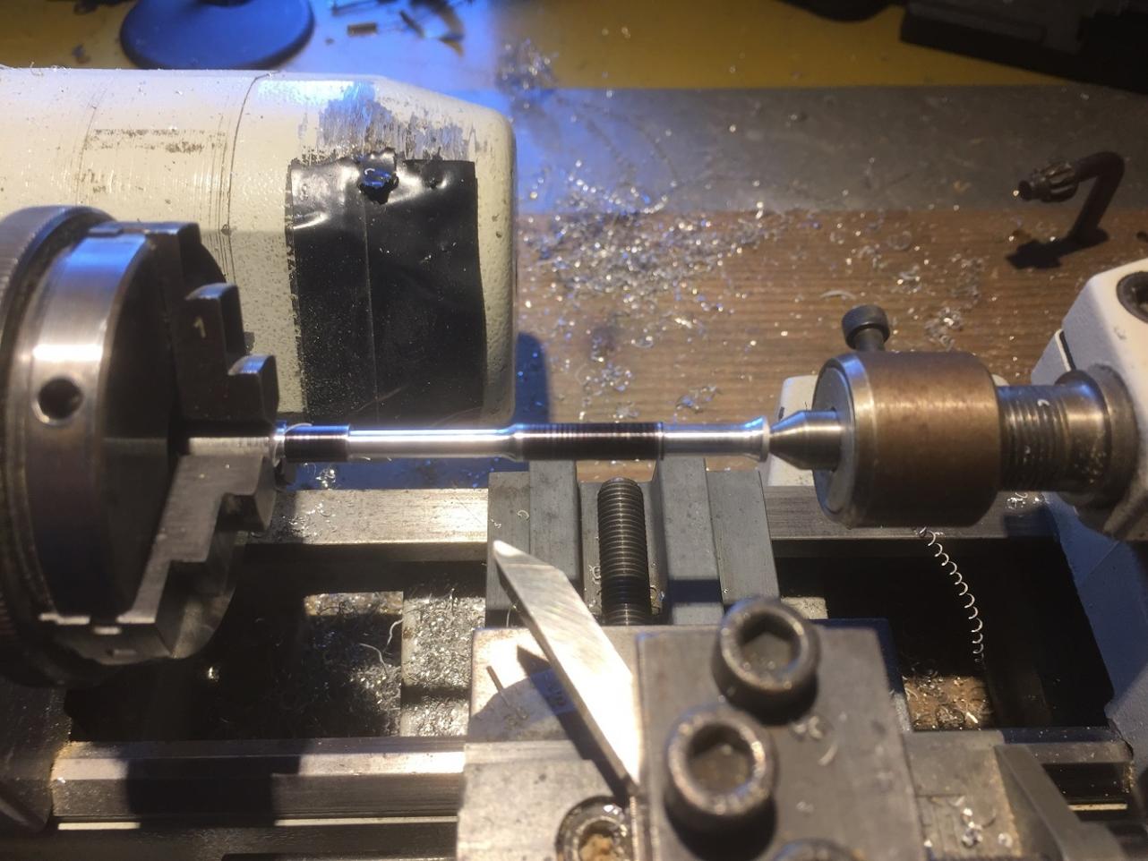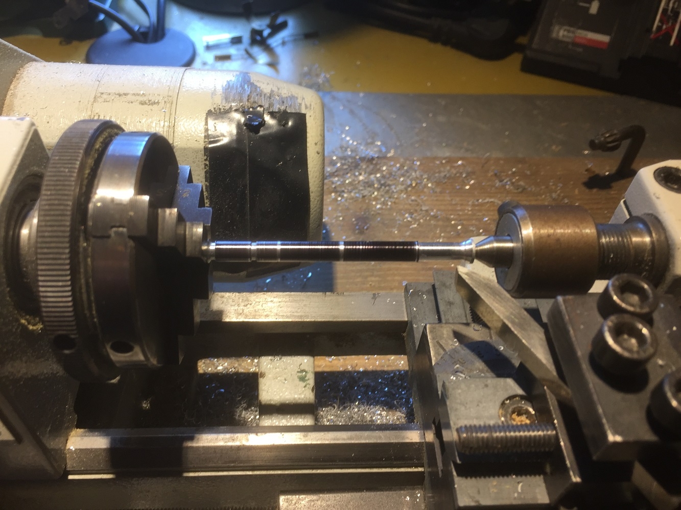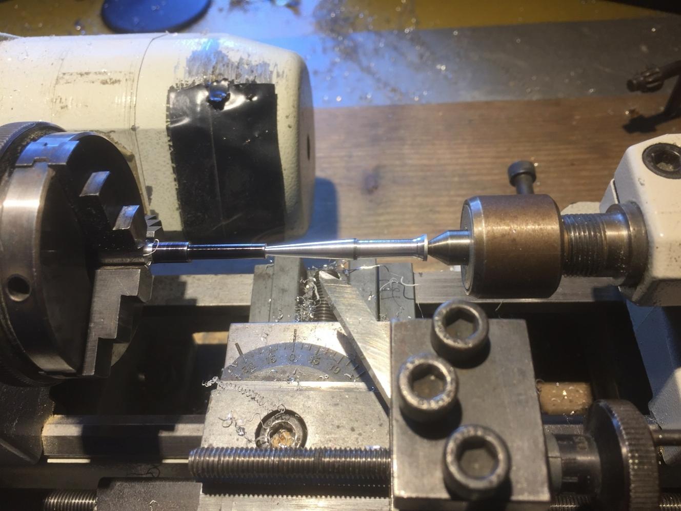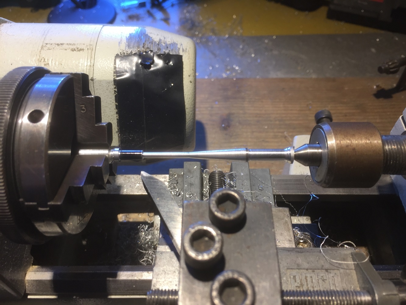 Turning the conical part of the scope, note that the smaller part not yet is to dimension, this gives you room to tweak with the angle of the conical part.