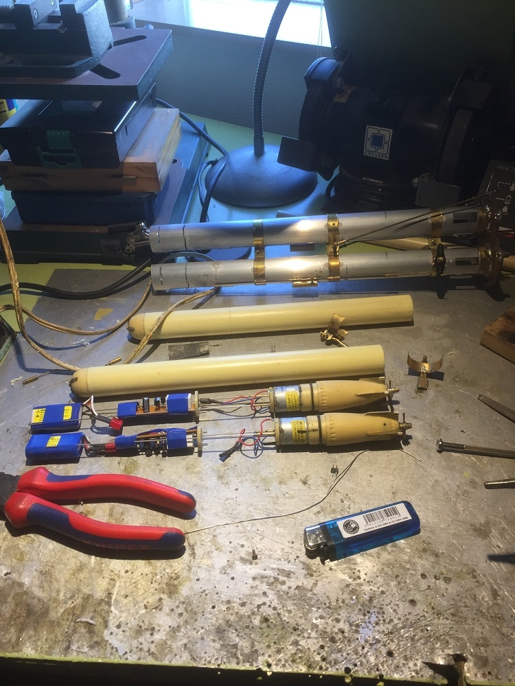 For now she's standing like this on the bench, scope ready and the antenna present, next hurdle is, making the resquebouy mechanism, i decided to work from the back to the front of the boat.