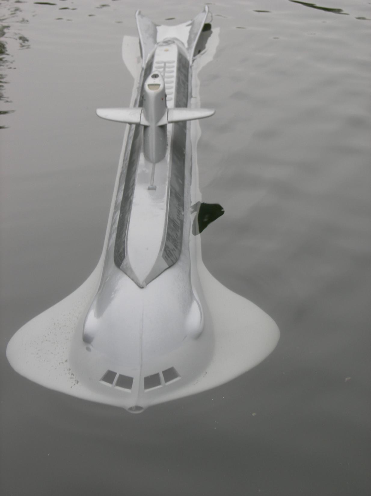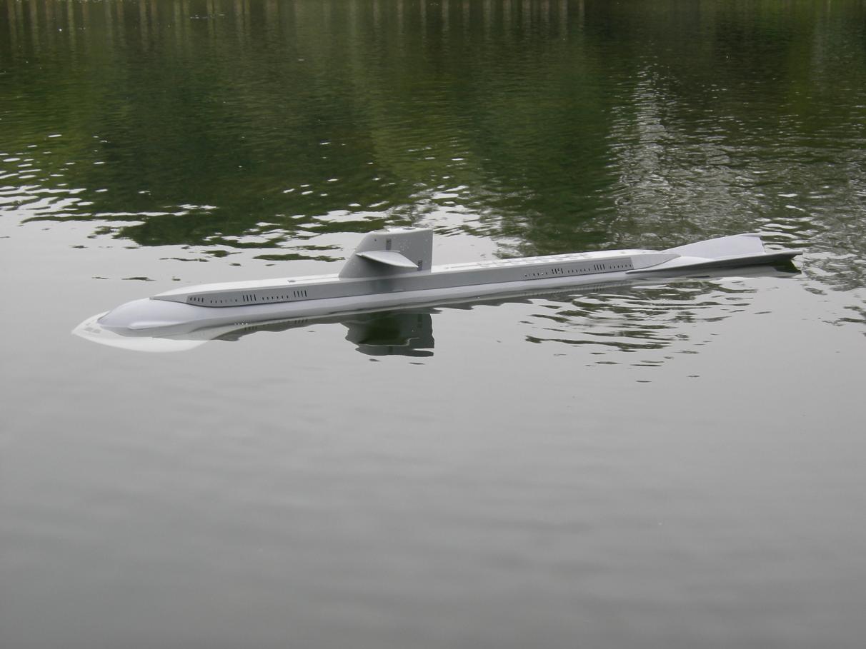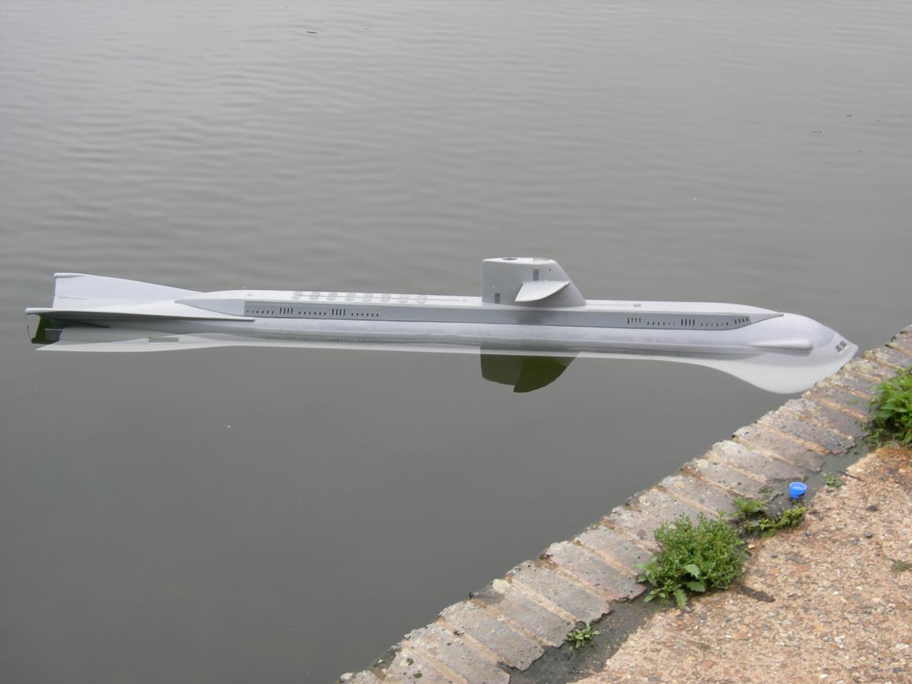 I have finally got my own 80 incher back in the water .Please see attached photos.I was suprised at how little lead was need to get her to sit at the water line showen.With out the air bags inflated the model sits at decks awash.The speed controller let me down so I was unable to see how the propusion jets worked.I will post more in the future when the bugs are sorted out.