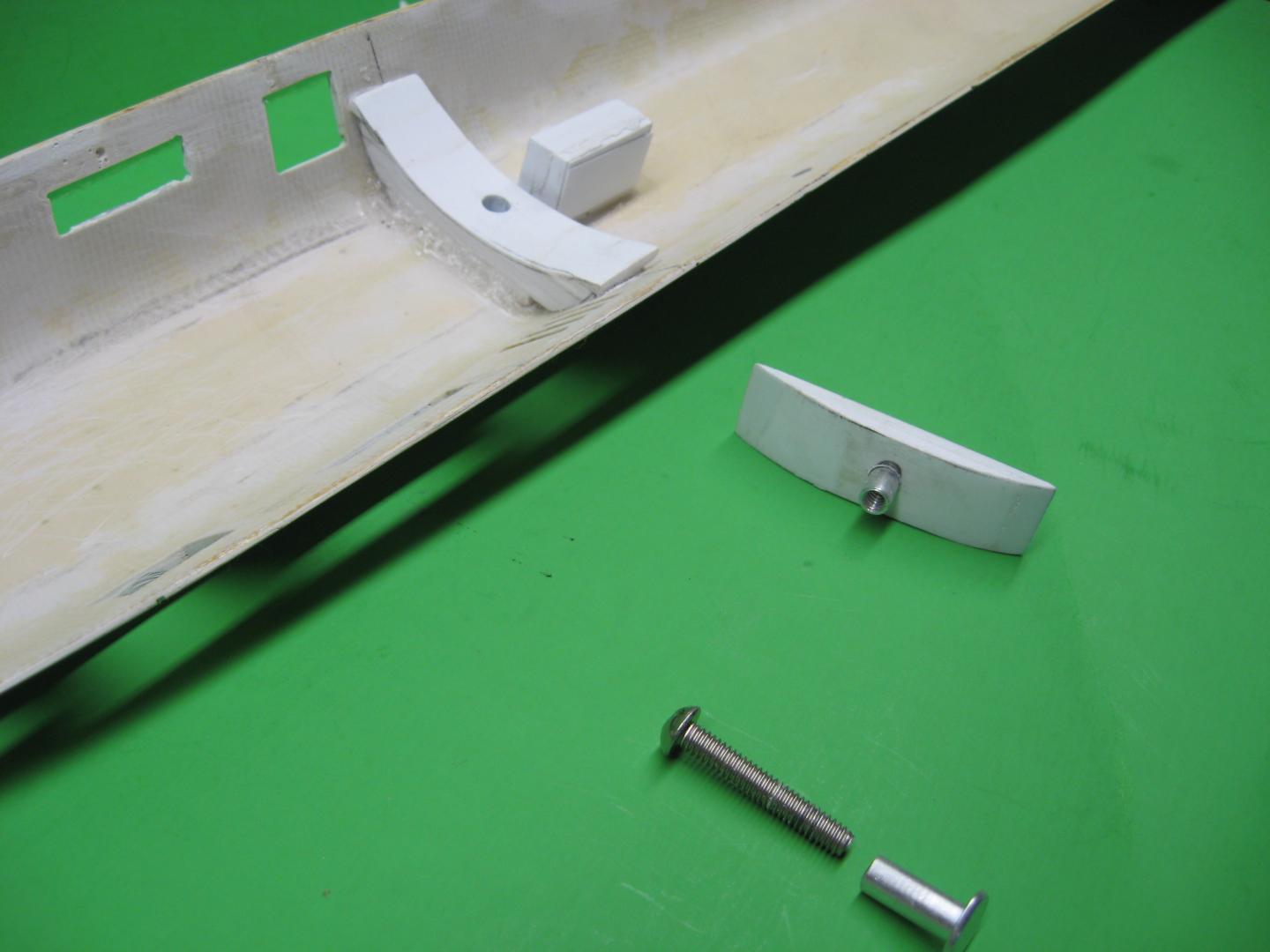 4 & 5- My goofy version of upper deck to hull lock, with aluminum threaded post under hull joist, makes up to stainless fastener through decktop.