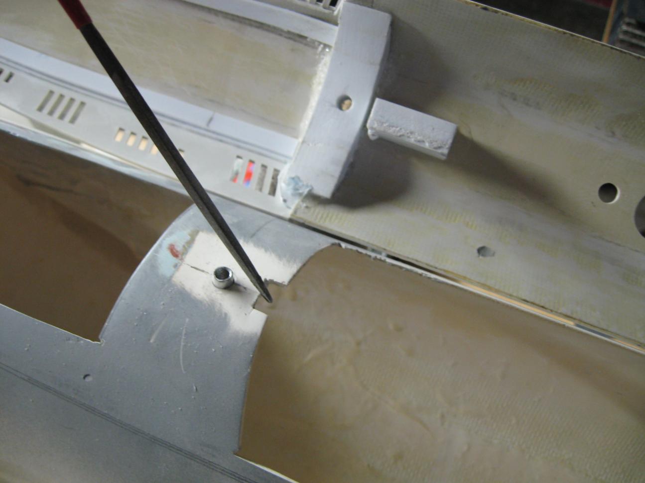 The opening at the top of the hull was WAY too wide etc...so I reduced it's width, shaped the front of the hole. Nice job, but I didn't take any pictures of the process. Woops. Too busy cursing bodywork labor.