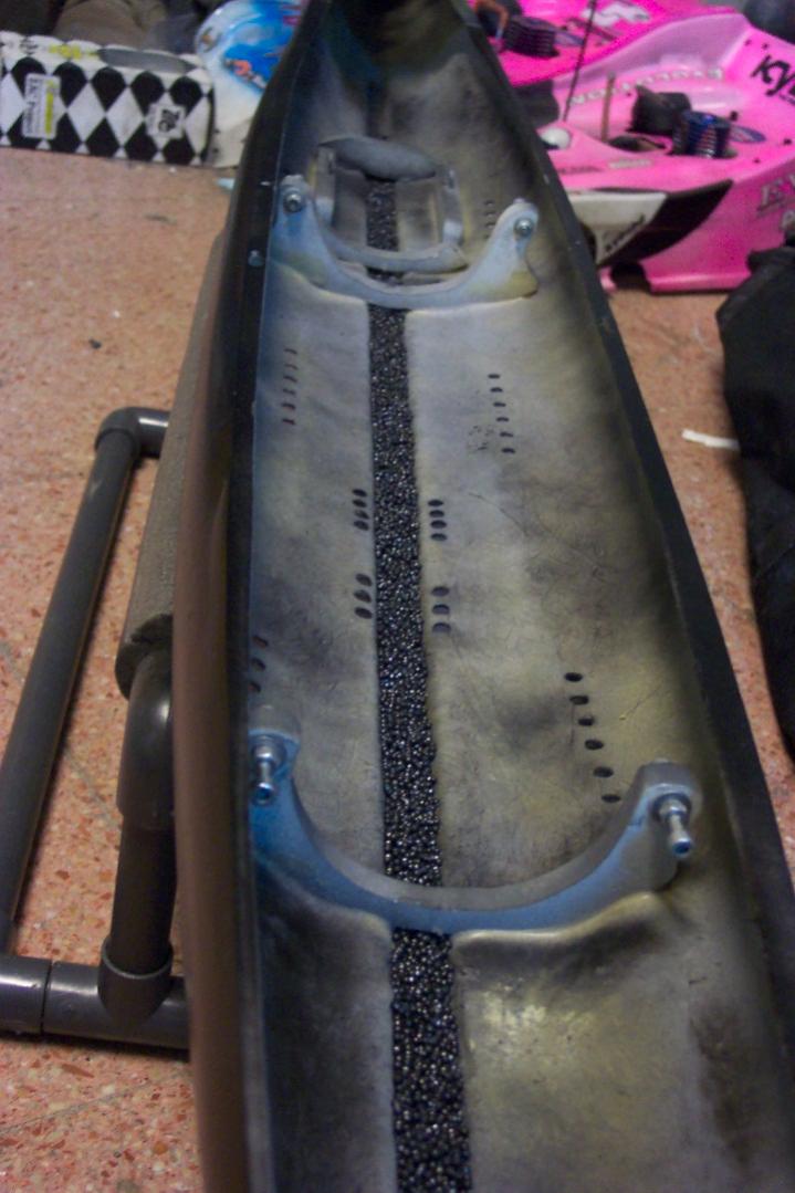 You can see the 3,5 Subdriver already fitted and some preliminary work to make the capacity of the ballast tank adequate to the needs of this ship.Also you can see the bulkheads for the subdriver and the lead shot added to the keel and fixed in place with drops of Ca. The foam added for the moment has given almost the right surface trim together with the foam fixed under the deck.It shows very good stabilty in the rolling plane thanks to the long arm force.well... next is testing the submerged trim.