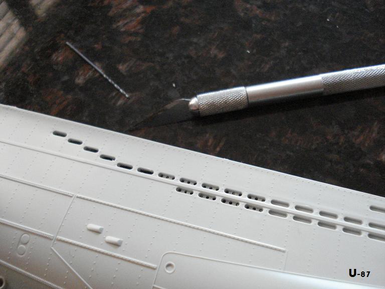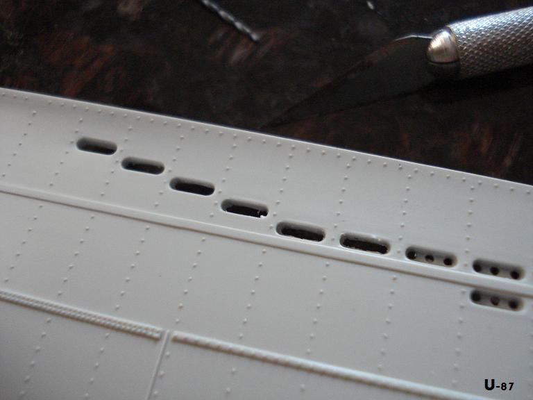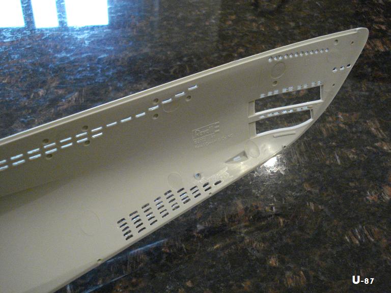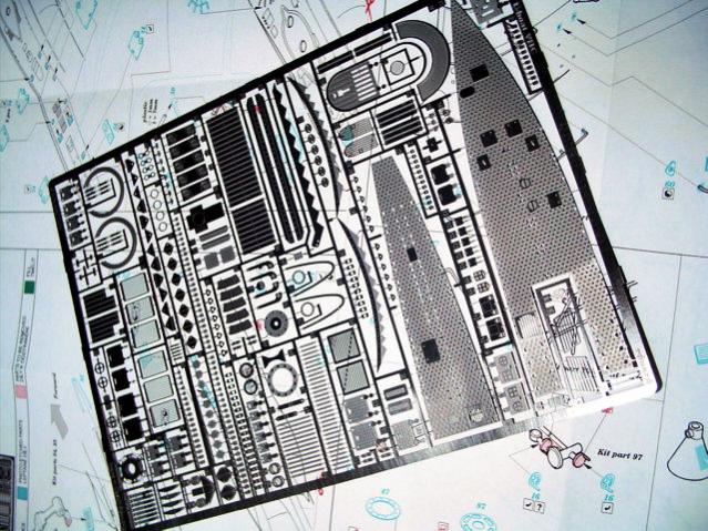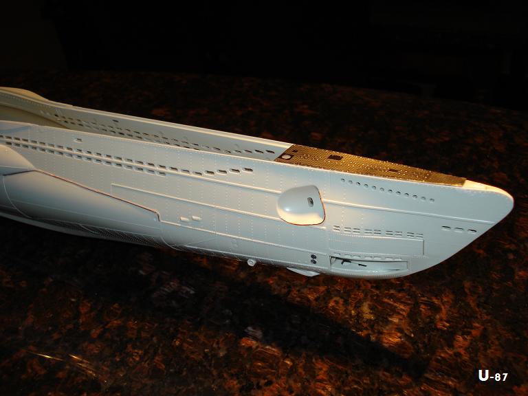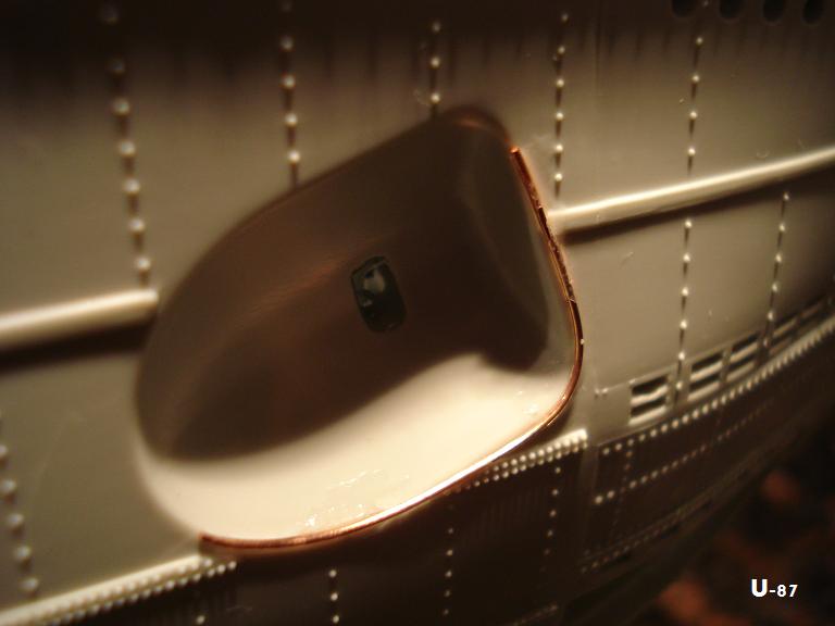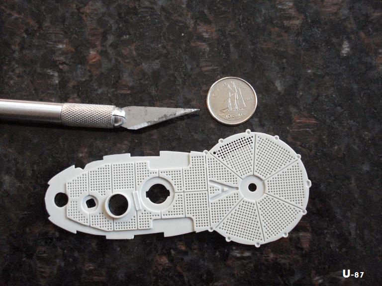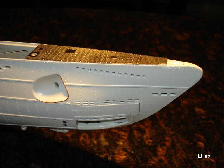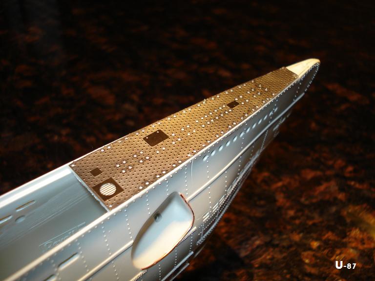 Incidentally, the etched brass/stainless deck and detail parts are stunningly beautiful. However, keep in mind that an r/c submarine is subjected to quick temperature changes and that the different thermal expansion rates of polystyrene and metal will exert extreme stress on the union points (glue). Use a flexible type glue to adhere the brass/stainless to the styrene to account for this. And don't use the etched limber hole inserts -- they will evidence the union seam between the etched piece and hull the first time you plop the hot model into the water.