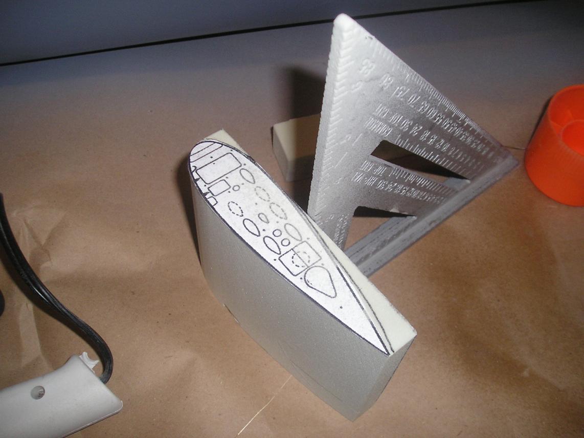 I had to make a parting board so i could split the plug in two. Pretty basic, just some particle board ripped down on my table saw with a hardboard top surface glued and stapled to the retangular shape. I cut out my plans and traced the shape to the hardboard then cut it out with my jigsaw. This cutout gave me my first true comparison of the hull shape to the actual print, and the results are great, but as my buddies in Megadeth are prone to say; "So Far, So Good...So what!".