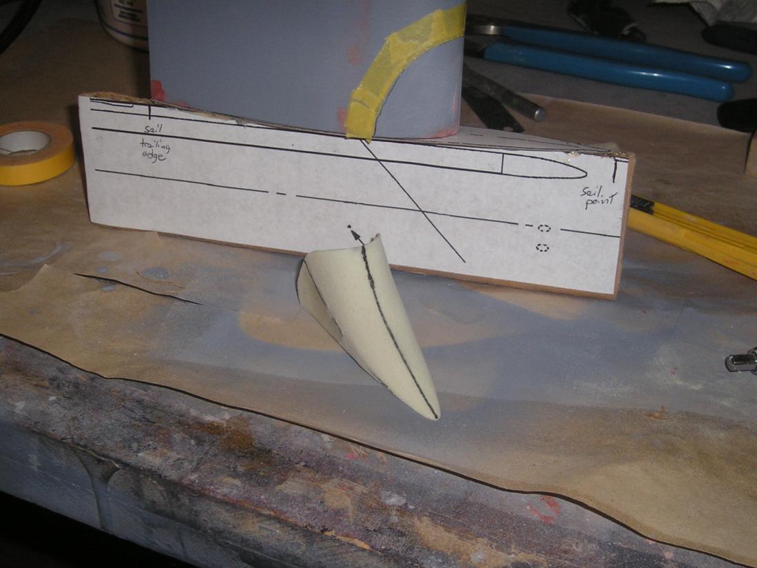 Today's work has been on refining the fillet shape along with some body work. Also, the cap has commenced construction. Note that there is a gap around the whole thing when placed on the sail. this is to accomodate the special coating beveling. Care is taken here to ensure that the demarcation line between the sail and fillet is consistent using masking tape as a depth guide when sanding.