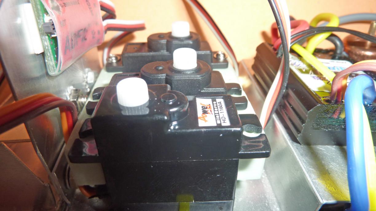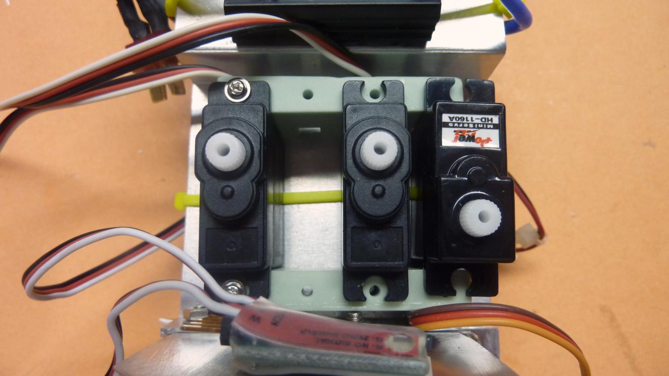 The problem is not the actual mounting of the servos - that's easy; the problem is how to mount the control horns/arms so that they don't foul one another. In all cases the push rods go towards the top or right in the pictures over the ESC.
