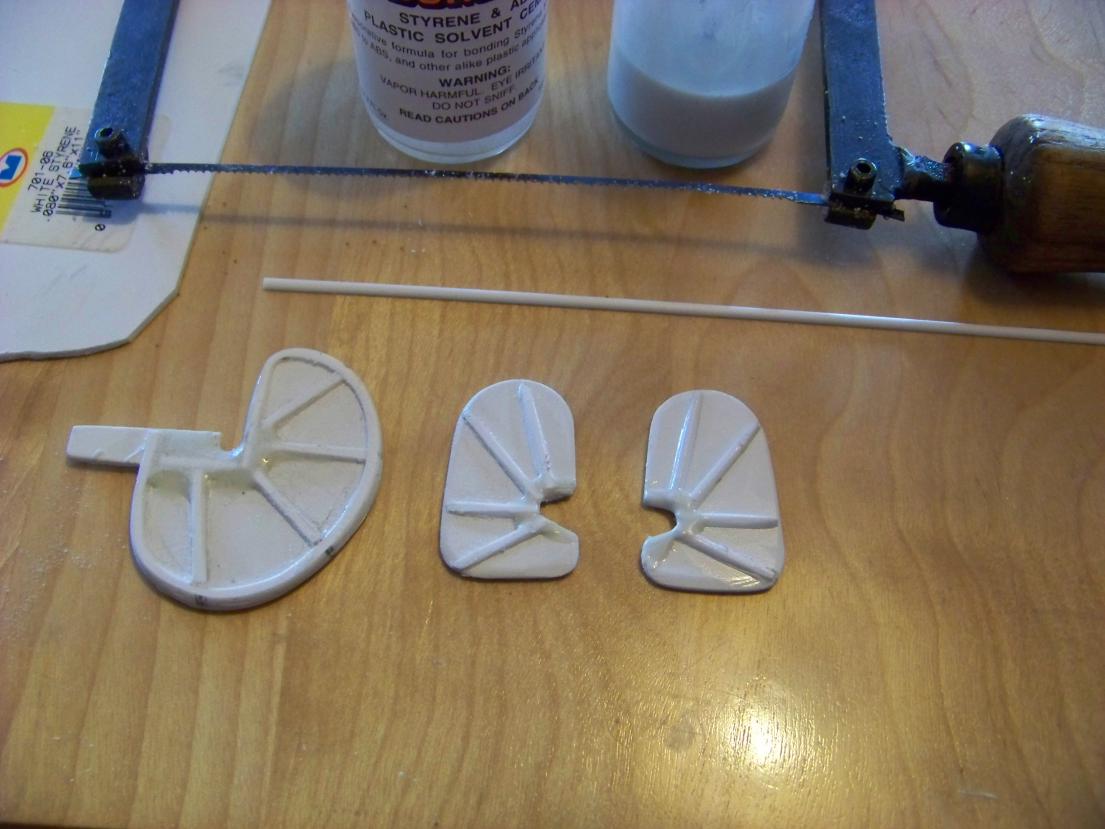 These 'control surfaces' (I hate that expression) have ribs like the bones in a duck's webbed feet, and I have replicated that using some half round styrene rod. To smooth out the edges, I melted some styrene sprue in the Solvent Welding liquid and applied that to feather out the edges a little.