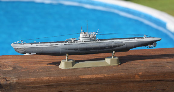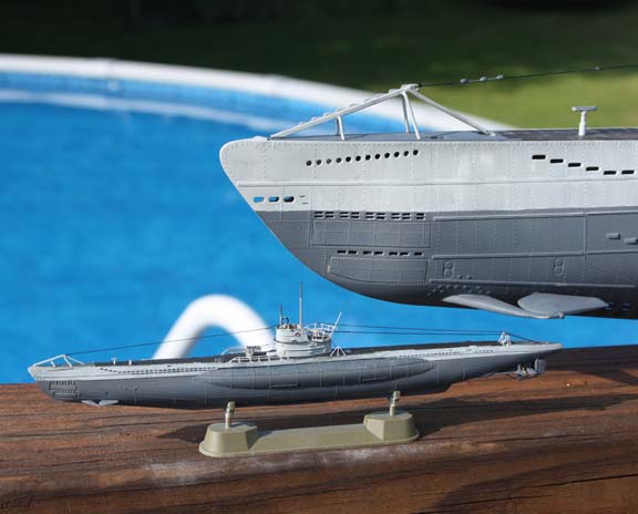 It will never (shouldn't say that) be an R/C project but saw this the other day at the hobby shop & couldn't resist. It is a full hull model but with a parting line to display it as a waterline model. I used some extra clic-on magnets to hold it together for display. The kit has plastic railings and also photo etch ones. The detail is quite amazing for it's size. The second photo is with the Revell 1/72 scale for reference!