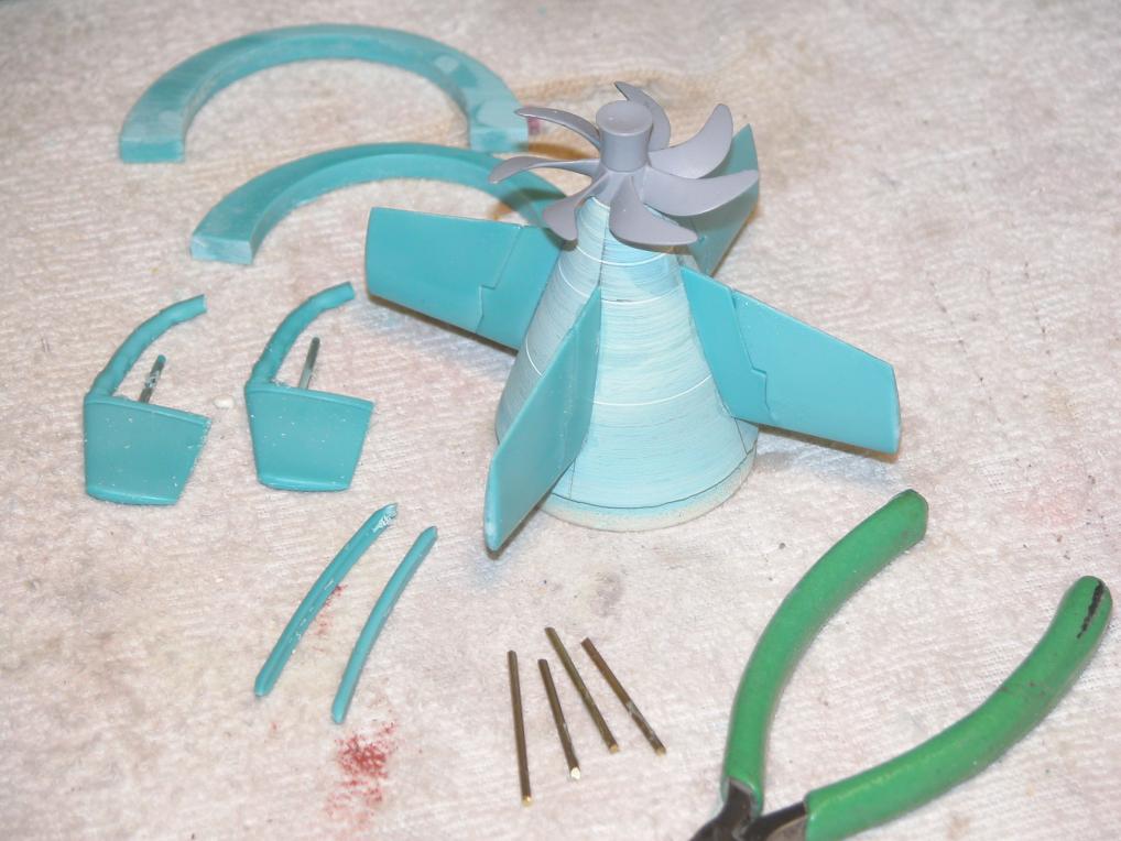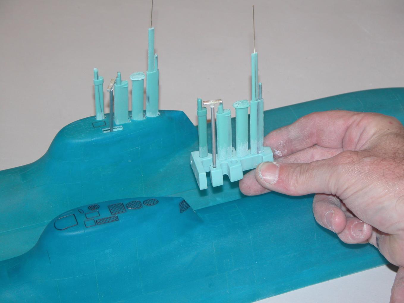 Much to the display of the Boss I've lavished even more work into the fittings package masters and tools the last few days: a complete set of masts and antennas including a foundation within the sail to support them (they are removable); a set of inter-hull indexing lips and a radial flange to make hull joining sure and easy; and I've made a new set of tools to better capture the two different type propellers the Type-212's have been known to sport.
