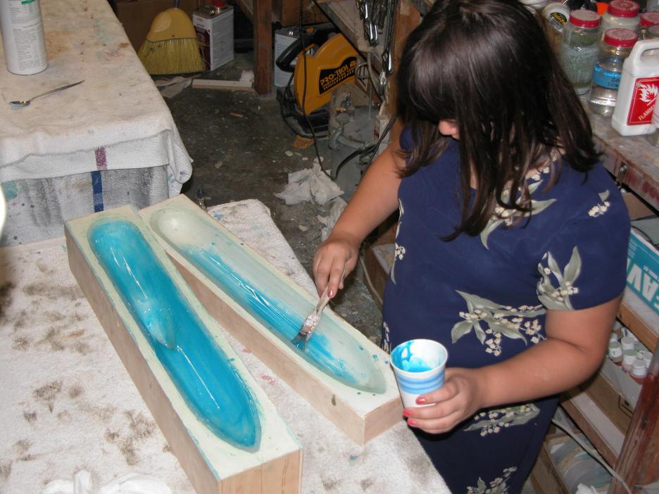 The kit hull halves are hand laid up to insure that the minimal amount of glass is employed and is saturated with the correct amount of resin.