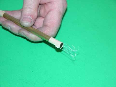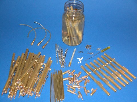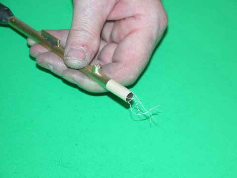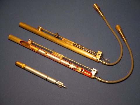 The sleeved tool above is used to push the interference-fit discs (a little hammer-and-anvil action required to slightly increase the diameter of the disc) into the bore of the launcher. The tool insures a disc is positioned the right distance from the breech opening and that the face of the disc is perpendicular to the axis of the bore. Once installed, the union between bore and disc is saturated with liquid rosin, a small shard of solder placed within the bore, against the disc, heat applied from the outside of the tube, and the molten solder permitted to spread around the perimeter of the disc, bonding disc and launcher tube permanently.