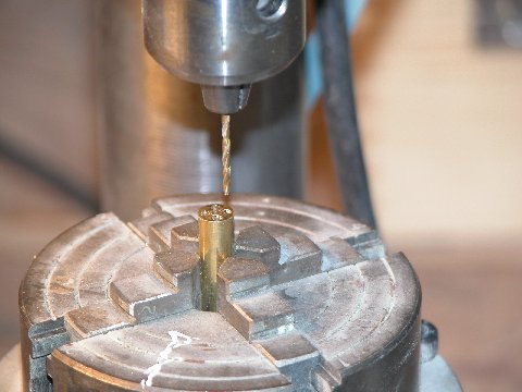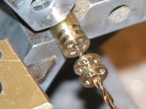 Mass production of the 'improved' torpedo stop-disc and stator parts starts with taking a length of machine brass round stock, the blank -- of a size that sleeves within the torpedo tube bore -- drilling out a center hole on the lathe, then transferring the work to a rotary head, and then punching out the four holes around the face of the blank with the drill press. All holes drilled to the shank of the drill bit, making each hole about a half-inch deep.