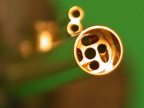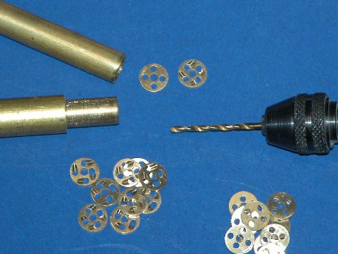 Torpedo stop-disc blanks to the right, canted stator holes completed on the torpedo stop-disc stators to the left. Canting the holes for a left-hand helix flow is an easy matter: Secure the blank in the jaws of a Jeweler's hand-vice so that just one hole is accessible above the jaws, insert the drill bit through it, bring the bit up to speed, and cant the bit slowly to a 45-degree angle to form the stator holes. Repeat the operation three more times and you have a completed torpedo stop-disc stator part, ready to be soldered within the breech end of a launcher.