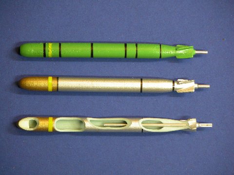 Illustrating how my gas propelled torpedoes are arranged. Note that the stabilizing fins are canted to twist the body into a left-hand roll as the weapont travels through the water. But, given a little thought, you can see that a forward advancing plume of axially oriented impulse gas would also work on the fins at the moment of launch, rolling the weapon to the right. The wrong spin!