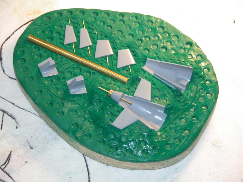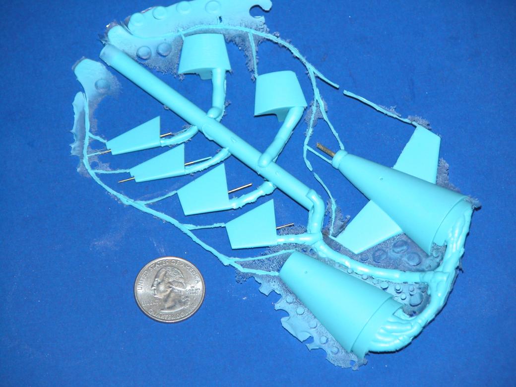 The shot of resin parts shown here reveals, to good effect, the design of the filling (sprue) and vent channeling cut into the rubber tool flange faces. The central cylindrical pouring sprue receives liquid resin at the top, gravity causes it to drop; the height of the liquid equates to the pressure it exerts, so I put the most difficult to fill cavities (the two tail-cone cavities) as low as possible in the tool -- doing so insures maximum pressure on the most difficult to fill cavities. Note that as the shapes of the resultant parts get simpler, they are arrayed higher off the main sprue cylinder?