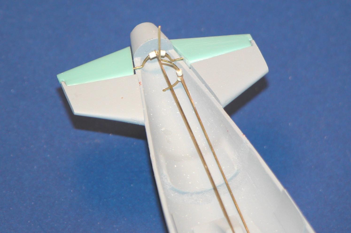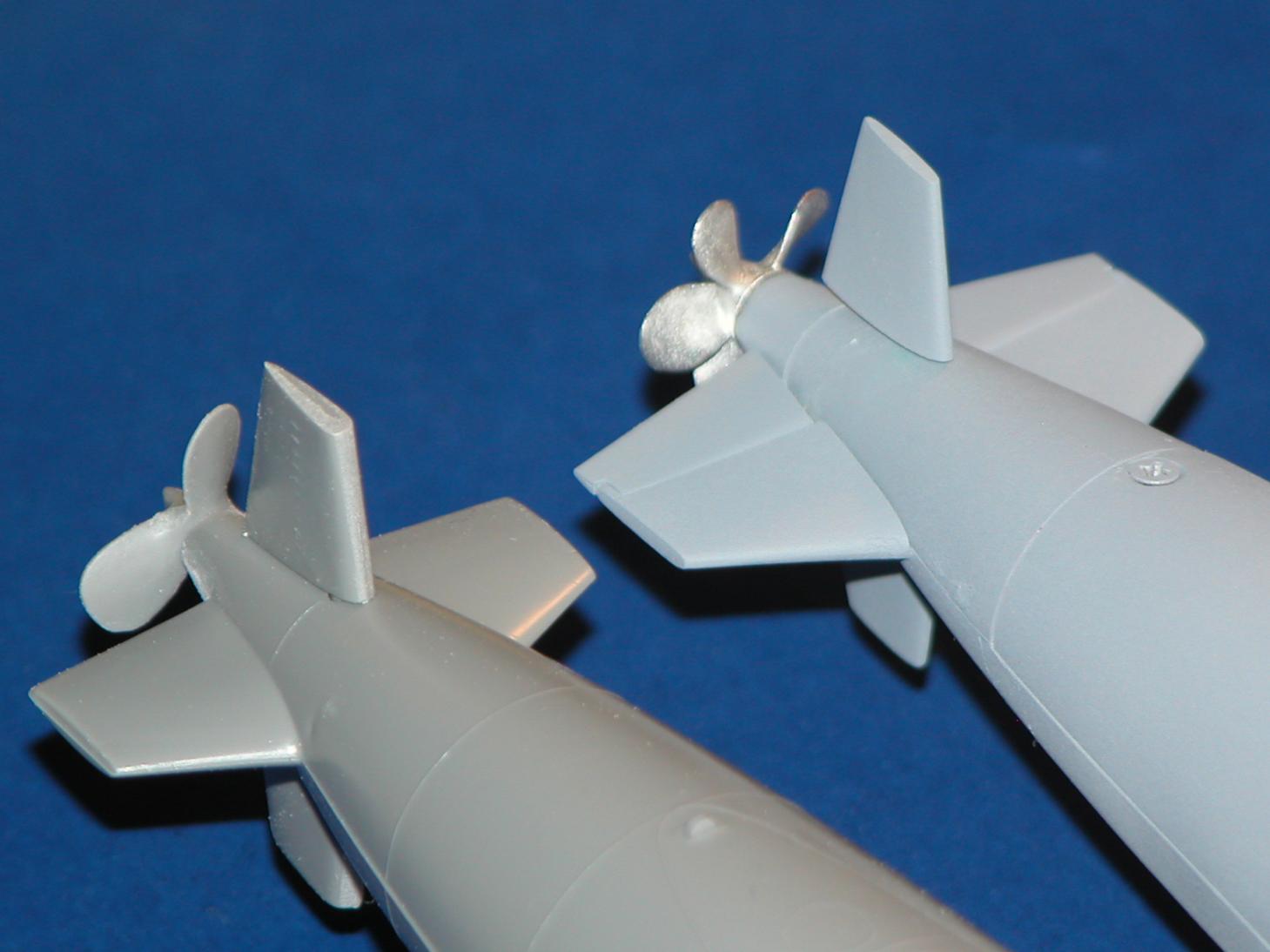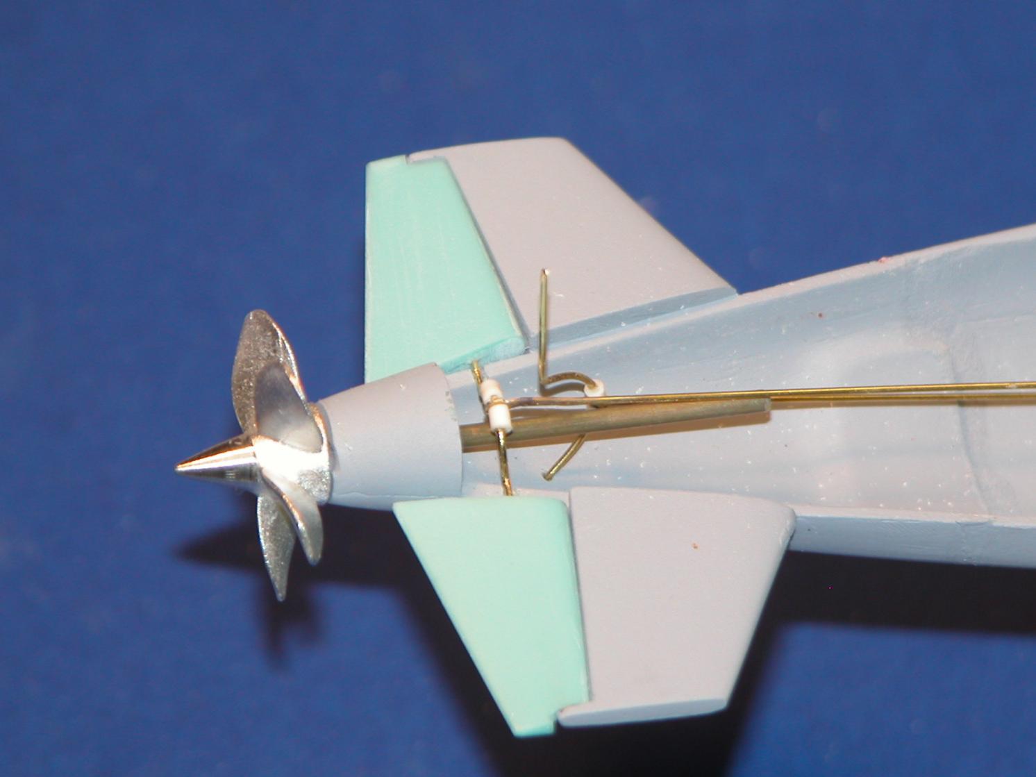 And here we have the same shot, but this time with the cast white-metal propeller installed. Note how the propeller shaft runs through the center of the two control surface yokes. Non-interference is the name of the game here!