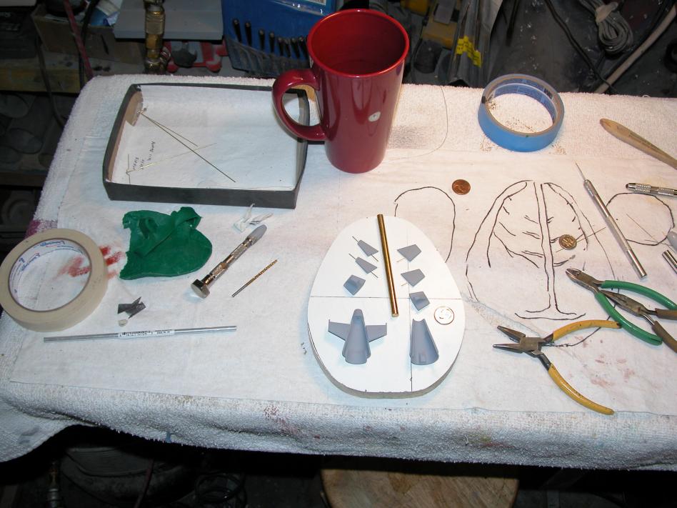 Resin casting requires careful tool design: you have to quickly introduce relatively thick resin and at the same time insure that the displaced air within the tool cavities has a route out of the tool. Laying the masters onto a paper towel I arrange them in a fashion that will involve the minimal amount of resin to cover them, also keeping in mind that I have to respect Newton, i.e. gravity has to do the work of getting the resin into the cavities and the displaced air out. Once I have a good sound fill-vent network down on paper, I transfer the masters to a mold board and I embed them into the clay.