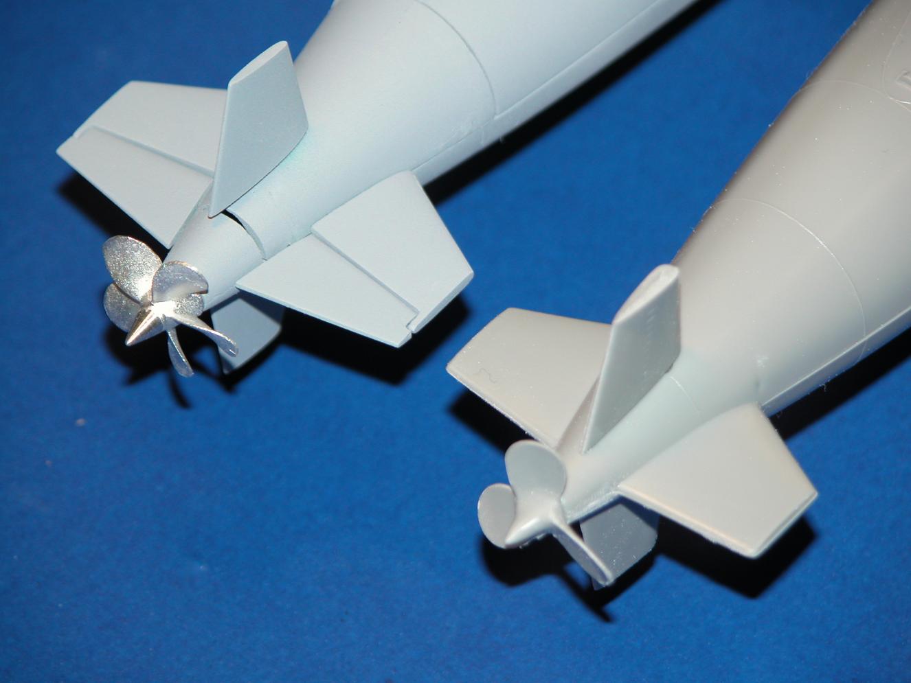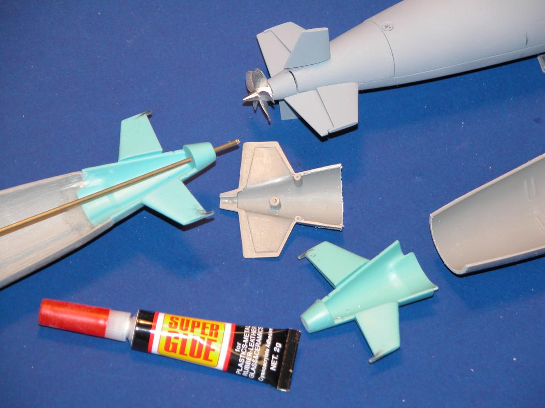 The two-piece cast resin stern is attached to the aft end of a kit hull once it's out-of-scale stern is chopped off with a razor saw. Only the bottom half of the new tail-cone is permanently bonded with CA adhesive. Later, the upper half of the tail-cone is glued atop the lower half -- but only with RTV adhesive. If need be I can, with relative ease and no damage, pop the upper tail-cone off for servicing of the rudder or stern plane yokes.
