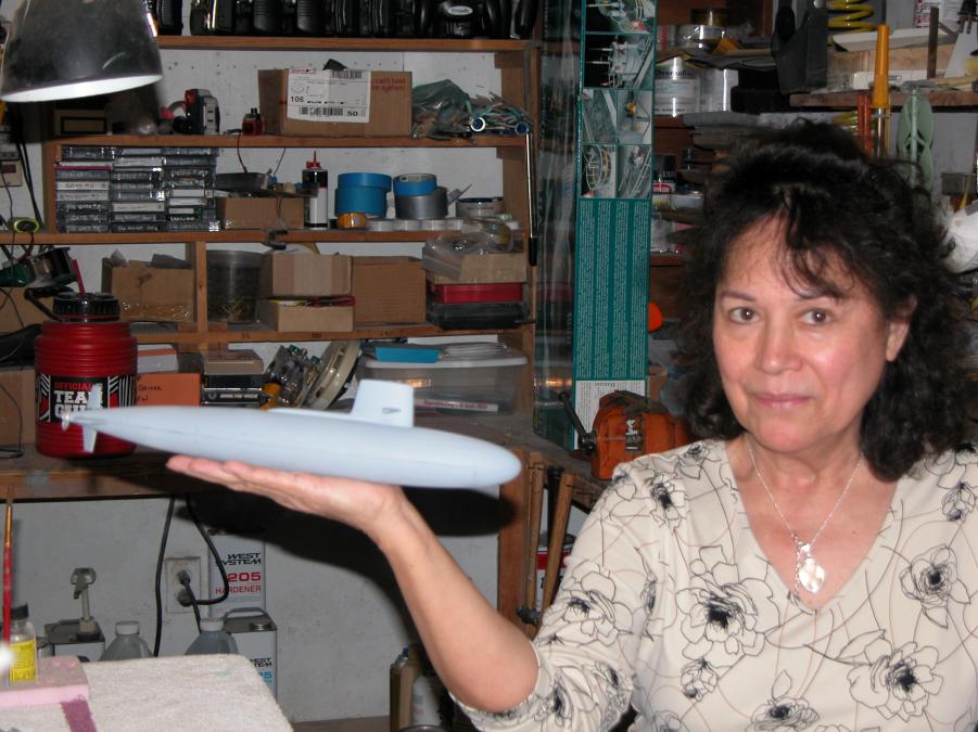 Here's Ellie holding the first completed conversion of the little Revell SKIPJACK kit. Tiny!