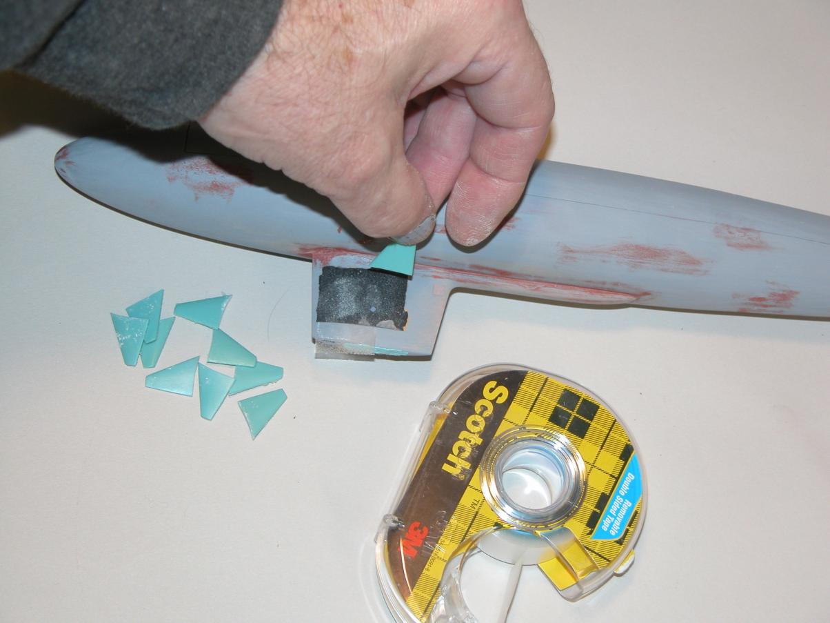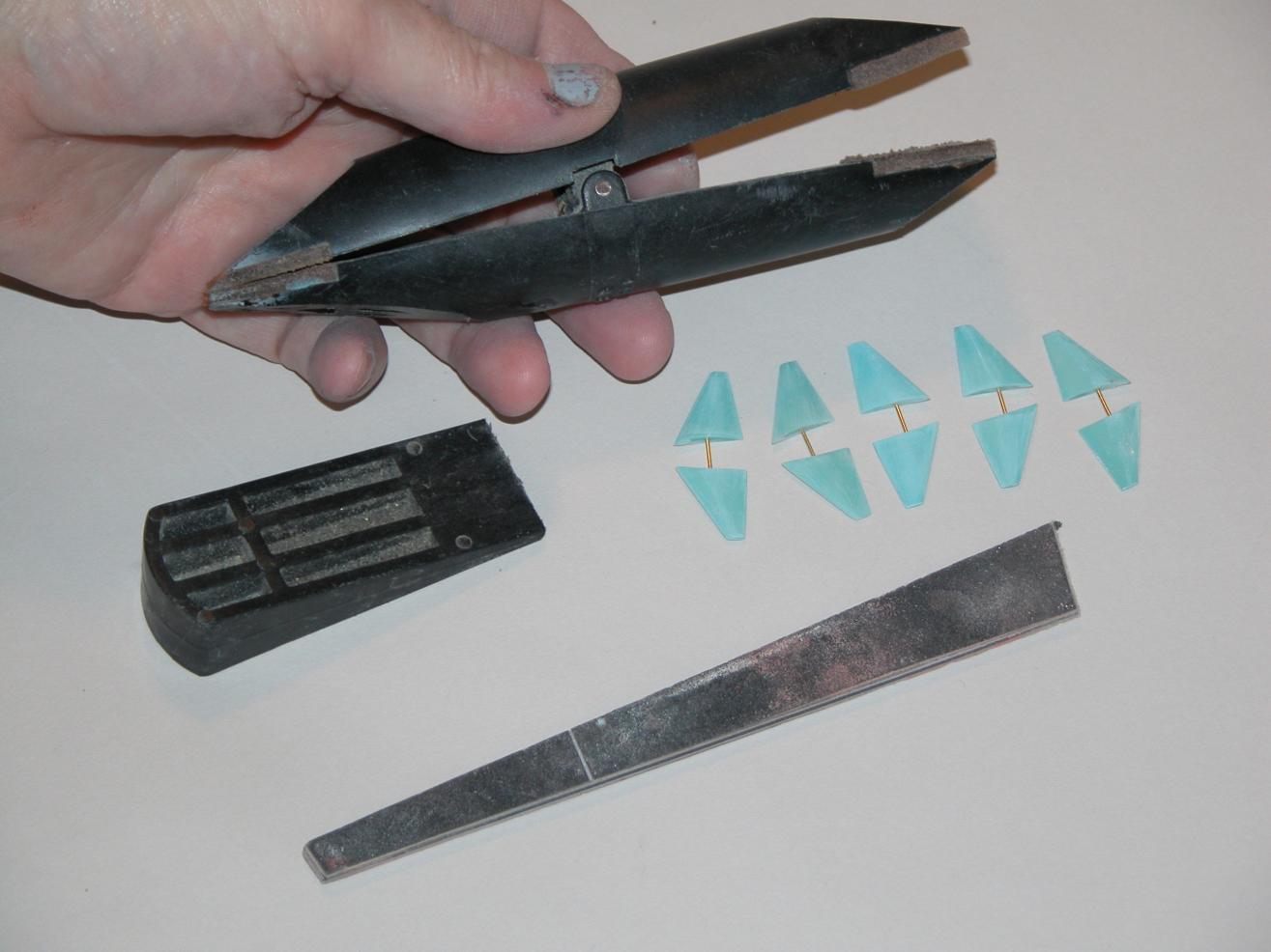 A sanding stick was used to remove any flash from the parts straight edges, but the concave curve at the root of the sail planes required a special tool. What I did was to identify the area of the sail under which the root of the planes would sit, mount a piece of #240 sandpaper onto the side of the sail with some double-stick tape, and to use the sail itself as a form upon which I would slide the root of a sail plane piece. In so doing I got the root of the sail planes to confirm exactly to the shape of the sail under which they would later be permanently mounted.