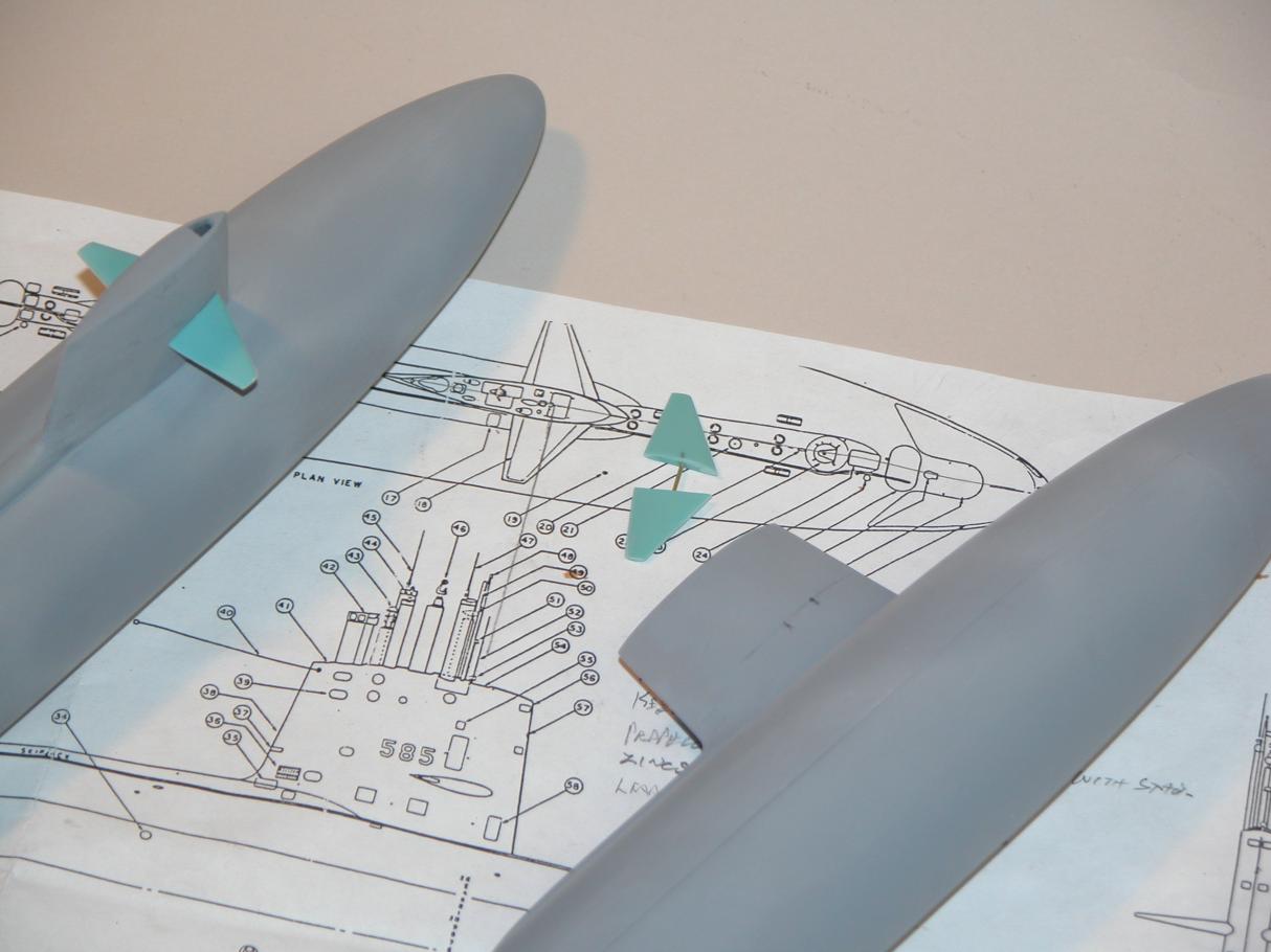 Also note that I made three little 'pin holders' -- basically a handle with a pointed wire, sized to be a tight fit in the bore of the resin control surface parts. This tool used to hold the work as I filed and sanded each to remove sprue and vent remnants and to give the part tooth in preparation of priming.