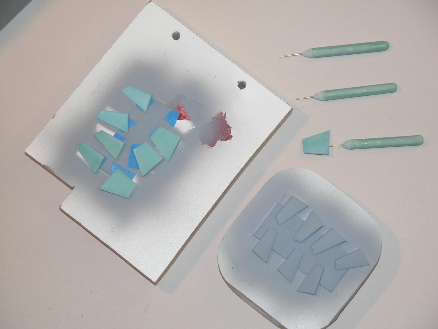 For the little SKIPJACK I determined that I would need six dedicated GRP stencil blanks. I would be draping 4-6 laminates of fiberglass cloth to six specific areas of the SKIPJACK model. To protect the model, forming the mold release system, were multiple, alternating coats of poly vinyl alcohol (PVC) and Buno type polishing wax -- this would keep the epoxy from bonding with the model, ruining the job.