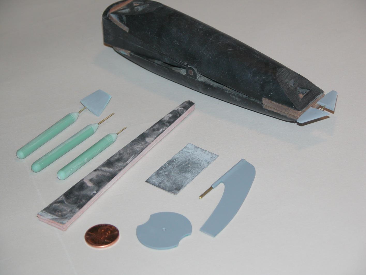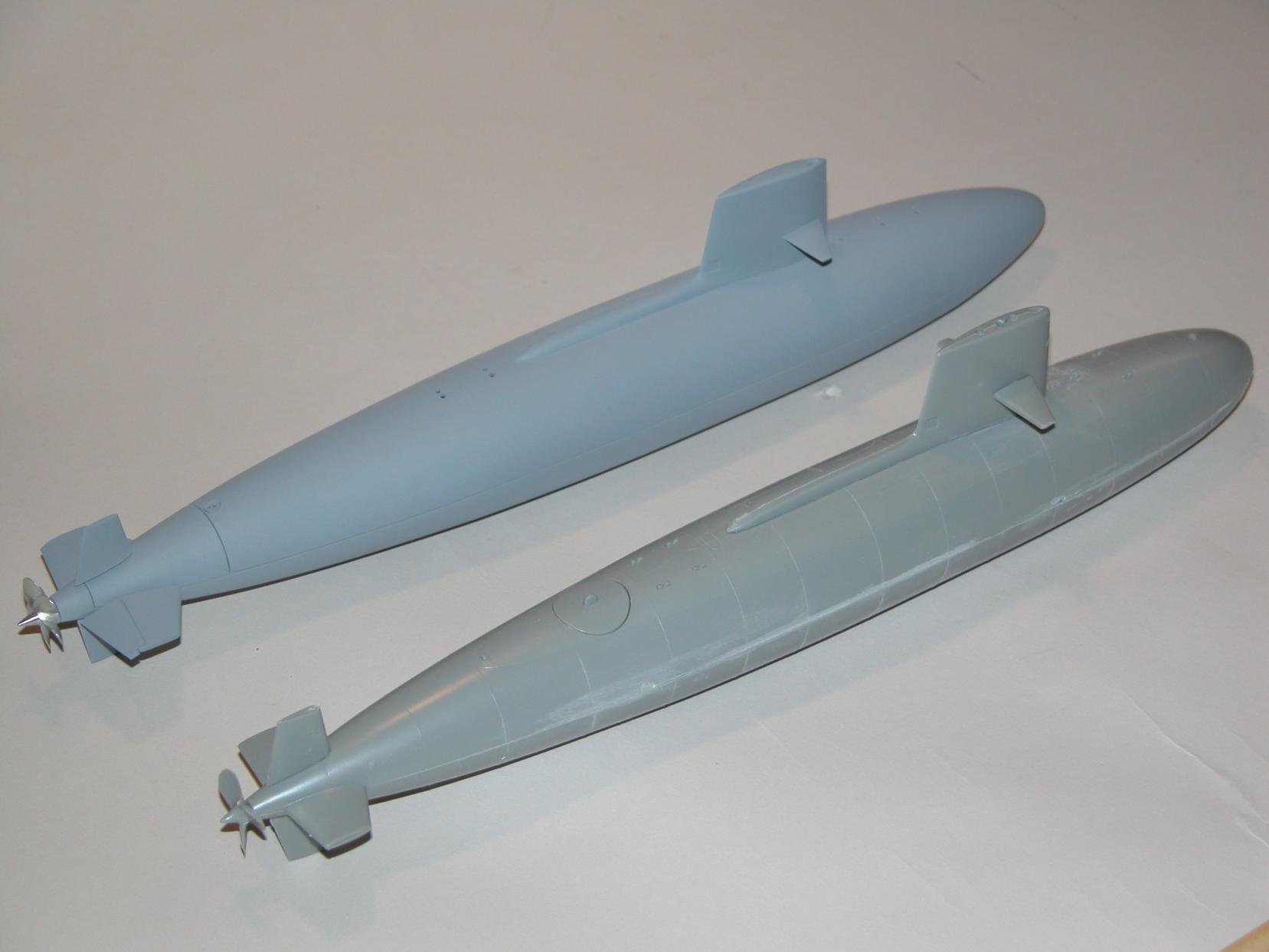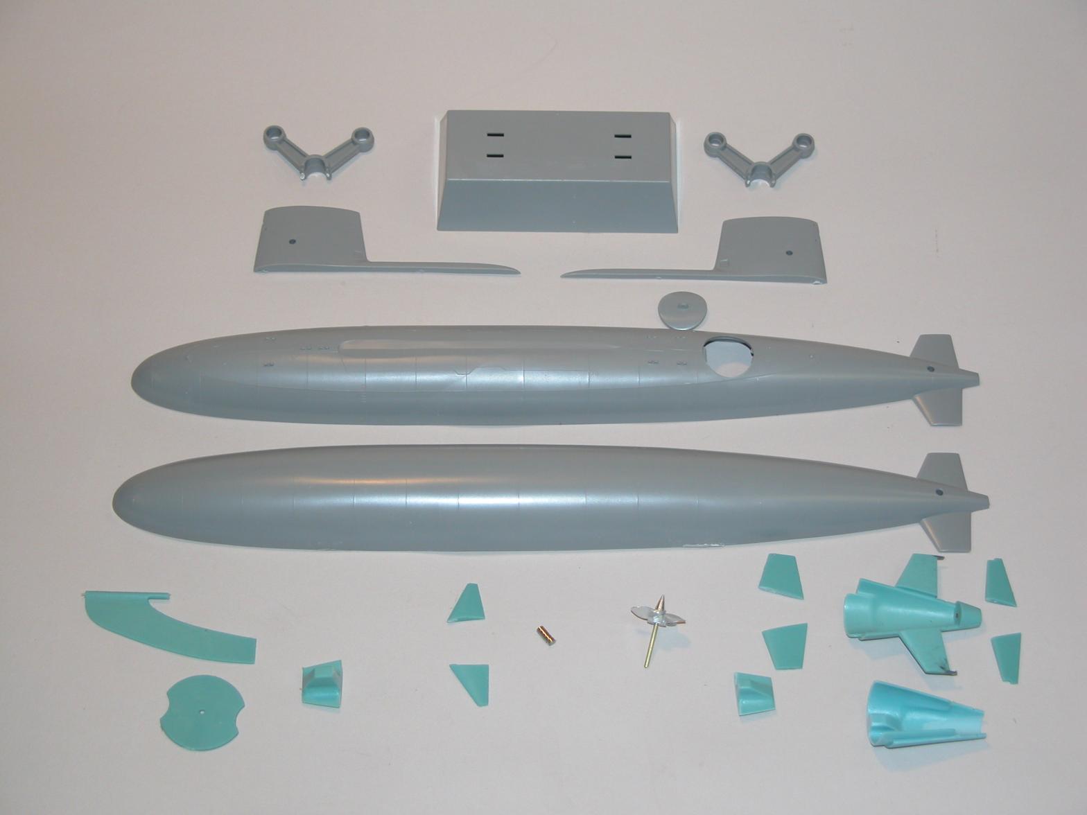 Here are some comparative shots of the raw little SKIPJACK model kit along with the fittings kit parts needed to get it up to my standard of perfection. Other shots are direct comparative studies of the raw kit and the kit modified to make it more scale-like as well as practical as a proper r/c submarine.