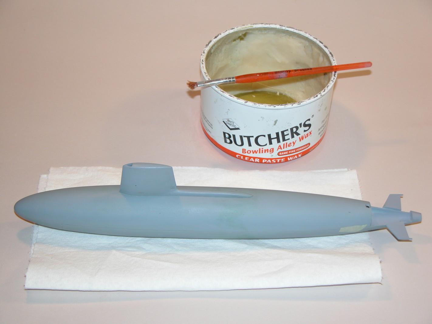 Scribing it the technique of mechanically cutting/scraping the surface of the model to achieve engraved lines. These lines representing access hatches, reversible cleats, hull penetrations, sonar windows, torpedo tube shutter doors, waterline (used later as a datum line when you get into the 'weathering' stage), and any other engraved line needed to represent demarcation points between hull and flush fitting components.