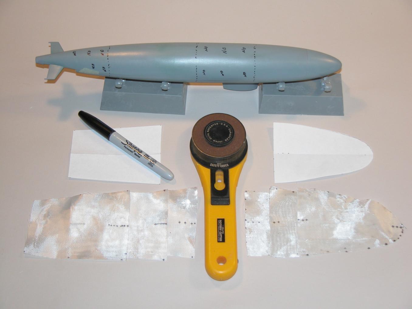 To meet the above requirements I fabricate my scribing stencils from four to six layers of four-ounce fiberglass cloth saturated with West System laminating epoxy resin. The meet the first requirement of such a stencil -- to get it to conform exactly to the models shape (no mater how radical a compound curve) -- I take the model itself, apply a mold release system (to keep the epoxy resin from permanently sticking to it), and lay up the glass over the area of the models surface where I will later be engraving lines.