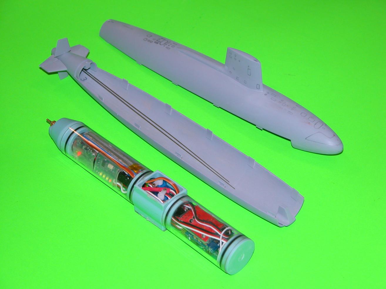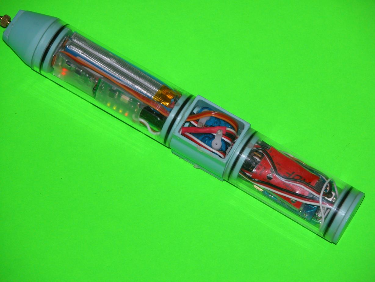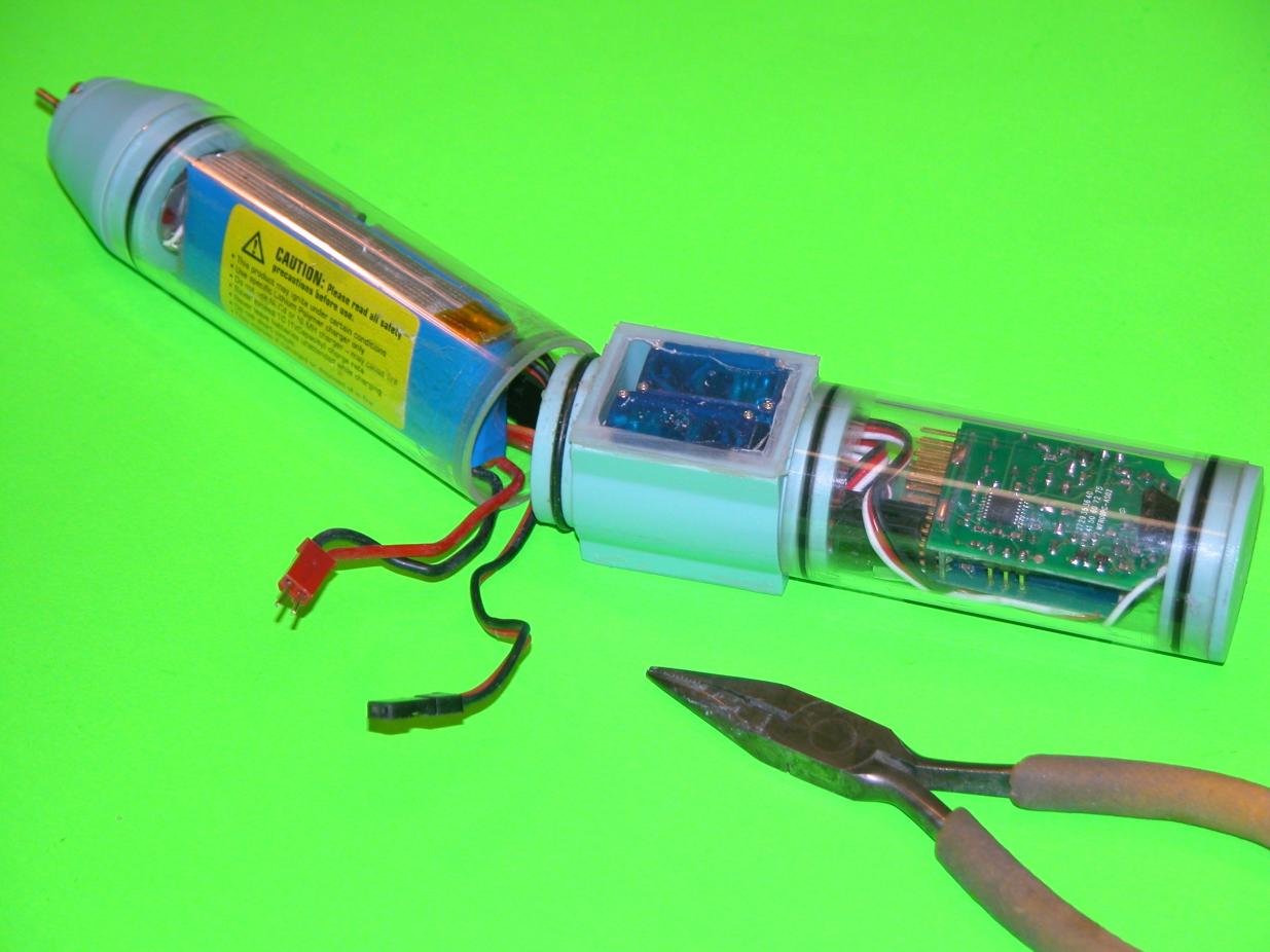 And a close-up shot of the final SD arrangement shows how the battery is accessed (never charge the battery while it resides within the cylinder!), and the unit is turned on and off. And this shots indicates of the new SD design: you can access the internals through four access points, all made with O-ring seals. This design feature permits me to custom fabricate (by varying cylinder length and servo box style) the little 1.25 SD to fit and operate specific small scale plastic model submarine kits.