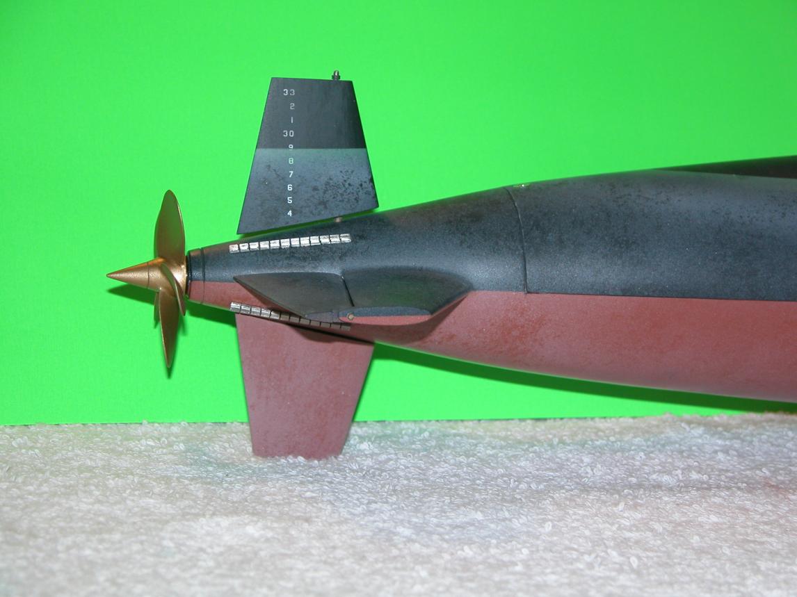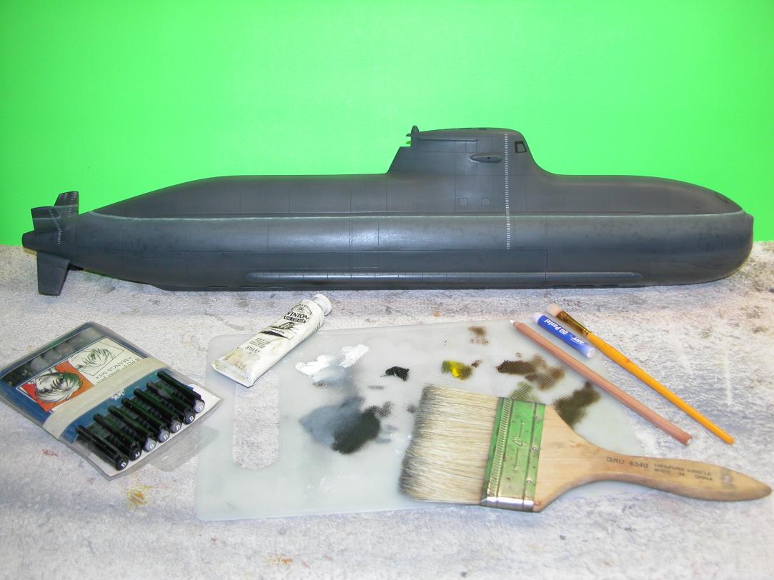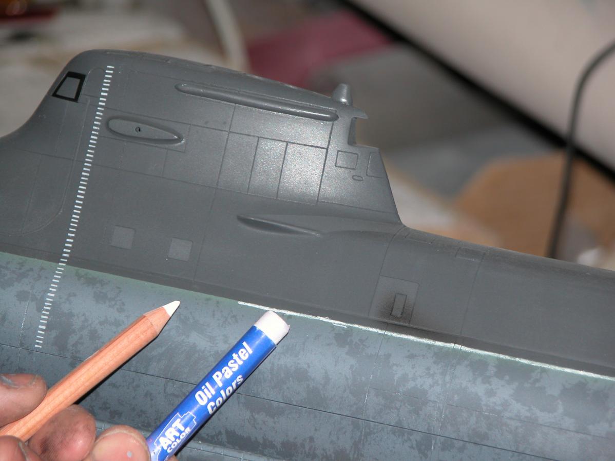The weathering mediums I used on this model included Artist oil paints (the radial streaking seen atop the upper stern control surfaces, sail, and superstructure; pastel oil pencil and crayons; and