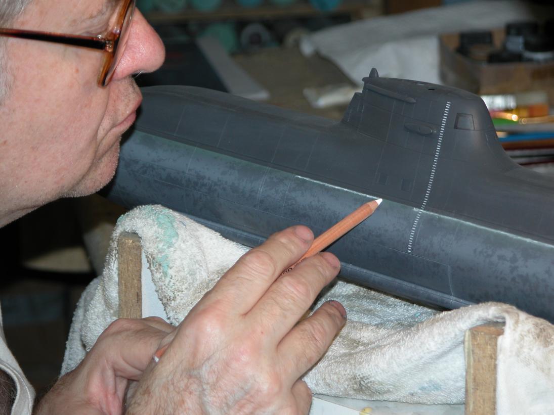 There is a nearly white 'scum line' at the waterline. This went down using either an oil suspended pastel crayon or pencil, applied free-hand to the sides of the hull. The white was then rubbed with finger, rags and then a stiff brush to blend it in a bit with the above and below waterline portions of hull.