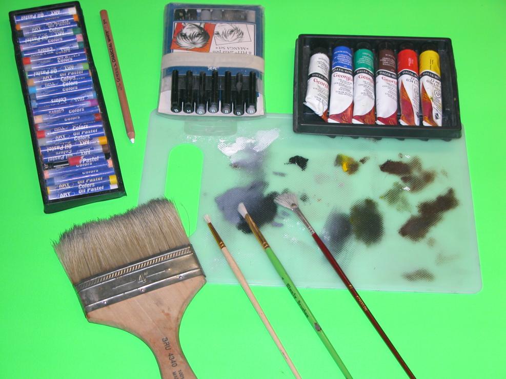 a selection of gray markers to clean up any pulled paint or other errors in the substrate. Application tools were various types of brushes; rags; finger; single-action, external mix air-brush; and texture sticks.