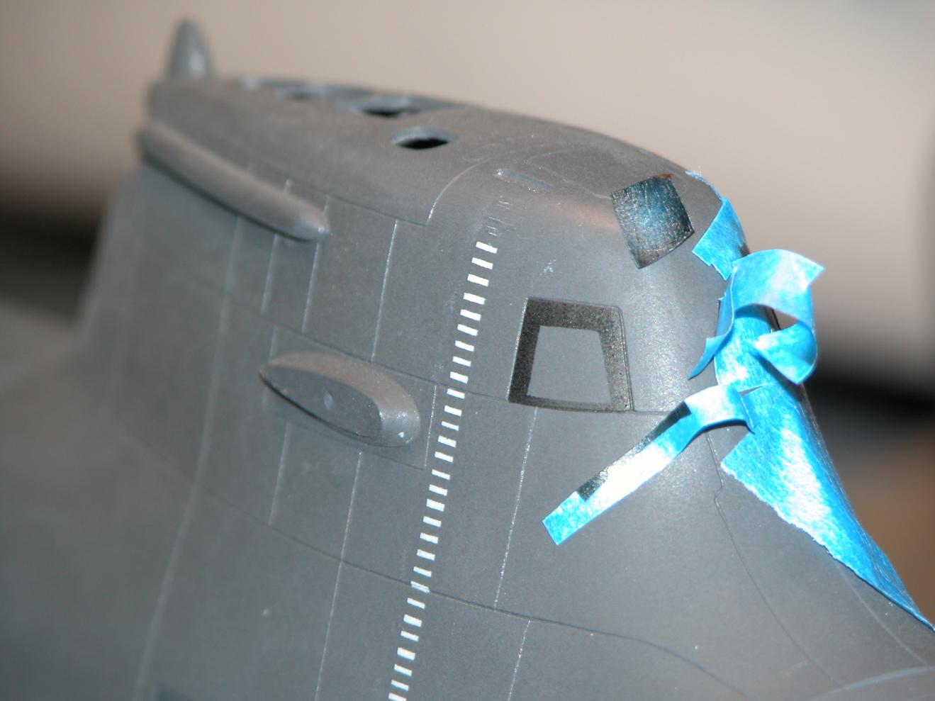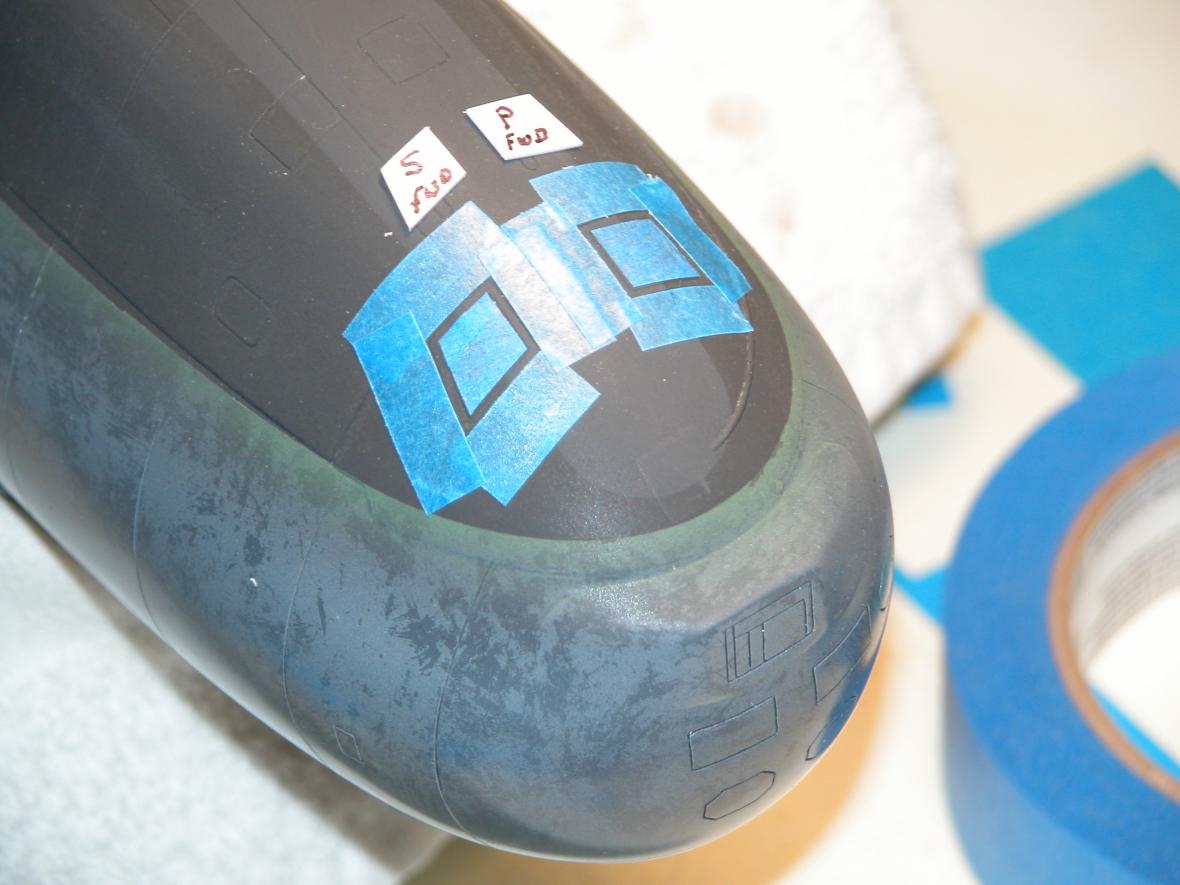 This morning I masked out the sail running light lens boarders and other deck and superstructure penetrations in preparation for some off-color painting, the idea was to use paint darker and lighter than the surrounding color to denote differences between these items and the rest of the structure. Careful study of the documentation told me where and what shade to paint things. Note that the diesel exhaust port got special attention not only with black to represent carbon soot, but also some scrubbing with oil paint mixed to a dark shade of gray to give it that 'exhaust' streaking look.