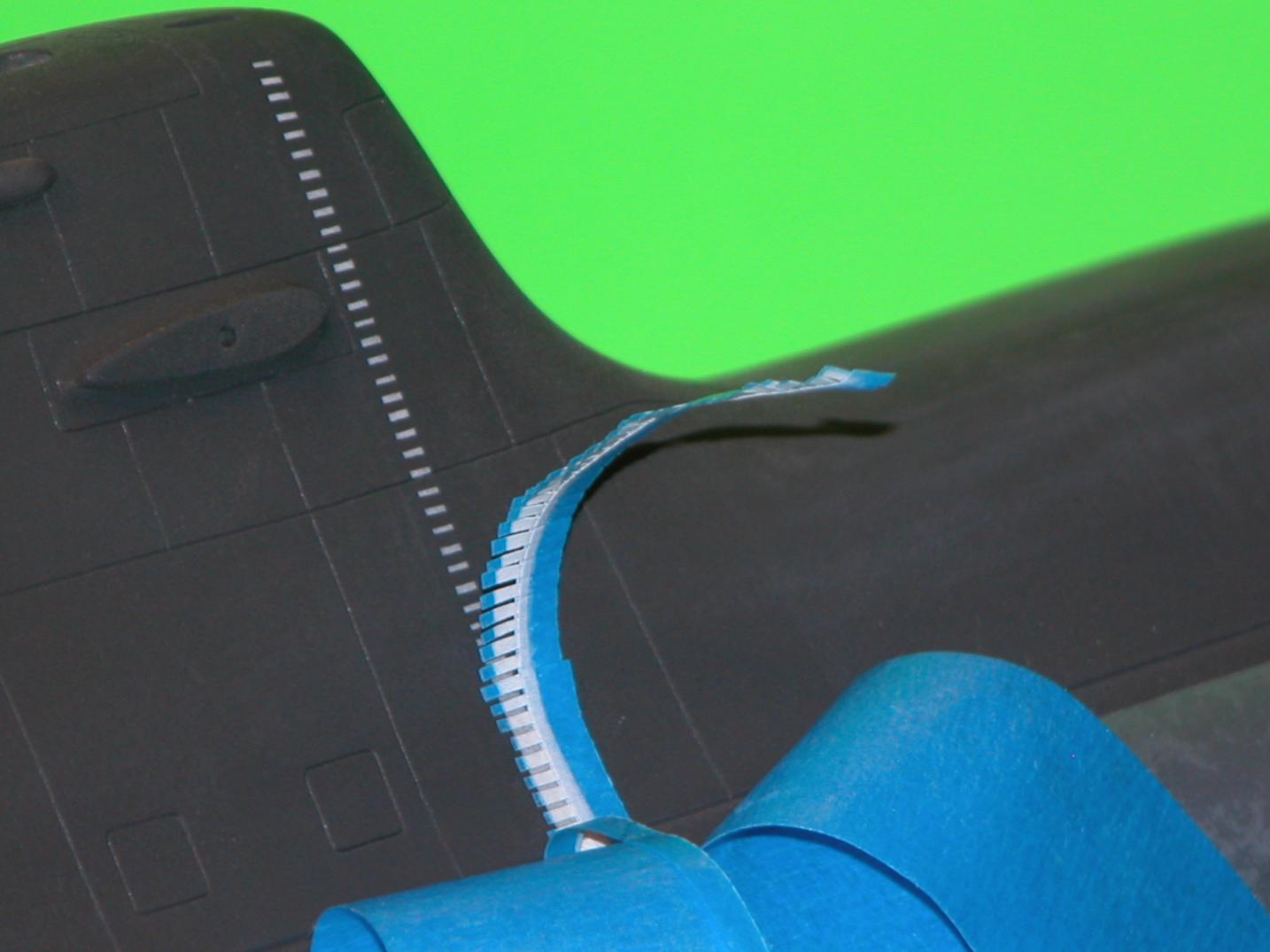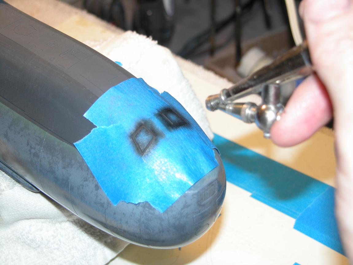 Note that for fine spraying I don't even bother to attach a paint cup to my old reliable single-action, Paasche, Model-H, master-blaster -- I simply use an eye-dropper to transfer just a few drops of paint from the mixing cup into the open port at the base of the spray-brush's needle. I also took the time to produce plastic stencils of some shapes to help me make masks. Helps when you are doing multiple models and plan to do more of the same in the future.