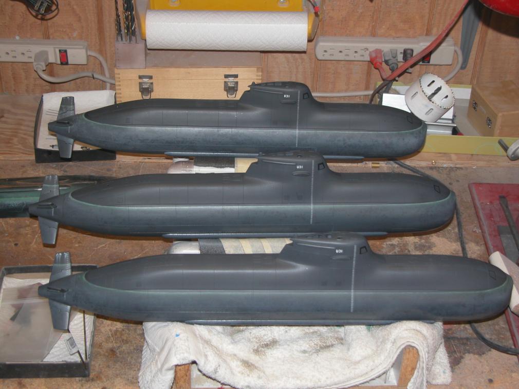 At the end of today's work you see three 1/96 Type-212s that show little evidence of operational wear-and-tear. But, I can assure you, these models have been properly weathered. The biggest sign of 'use' being the scum line between the paint-work above waterline and the paint-work below waterline. The last operation tonight was to fix all the paint and weathering mediums that had been applied to the models -- this a well flattened clear-coat. Tomorrow will present me with three models ready for more paint work and weathering.