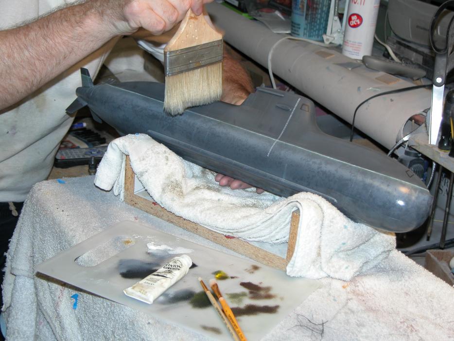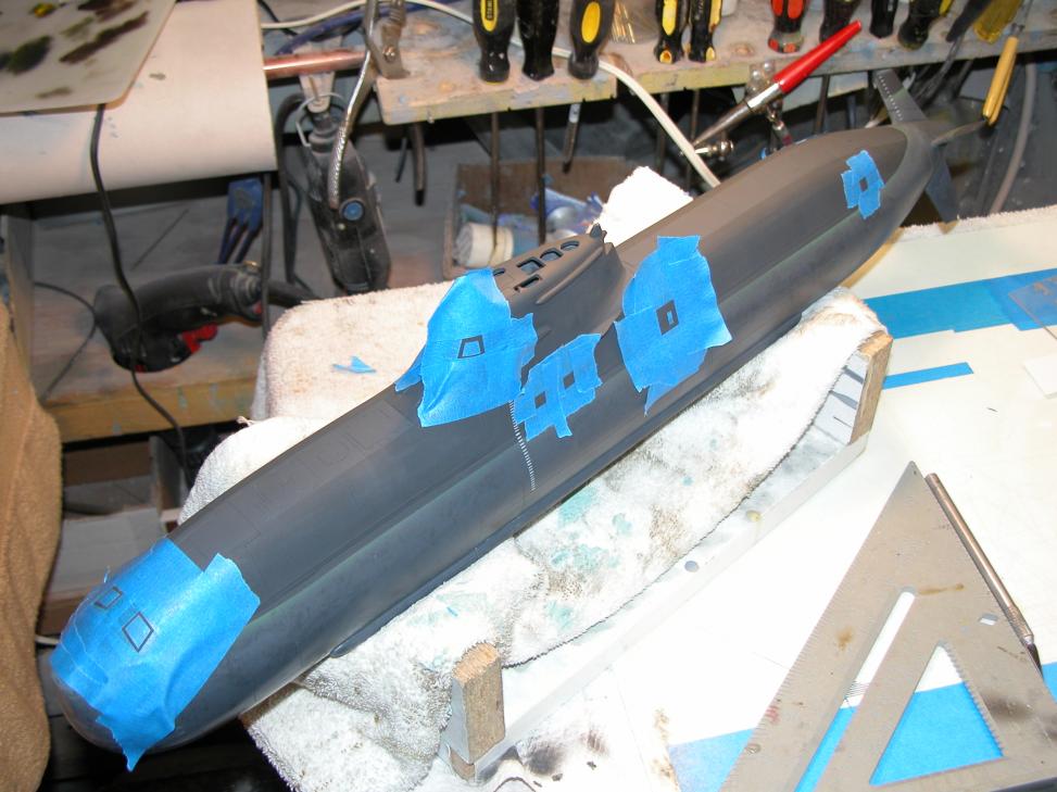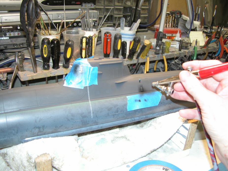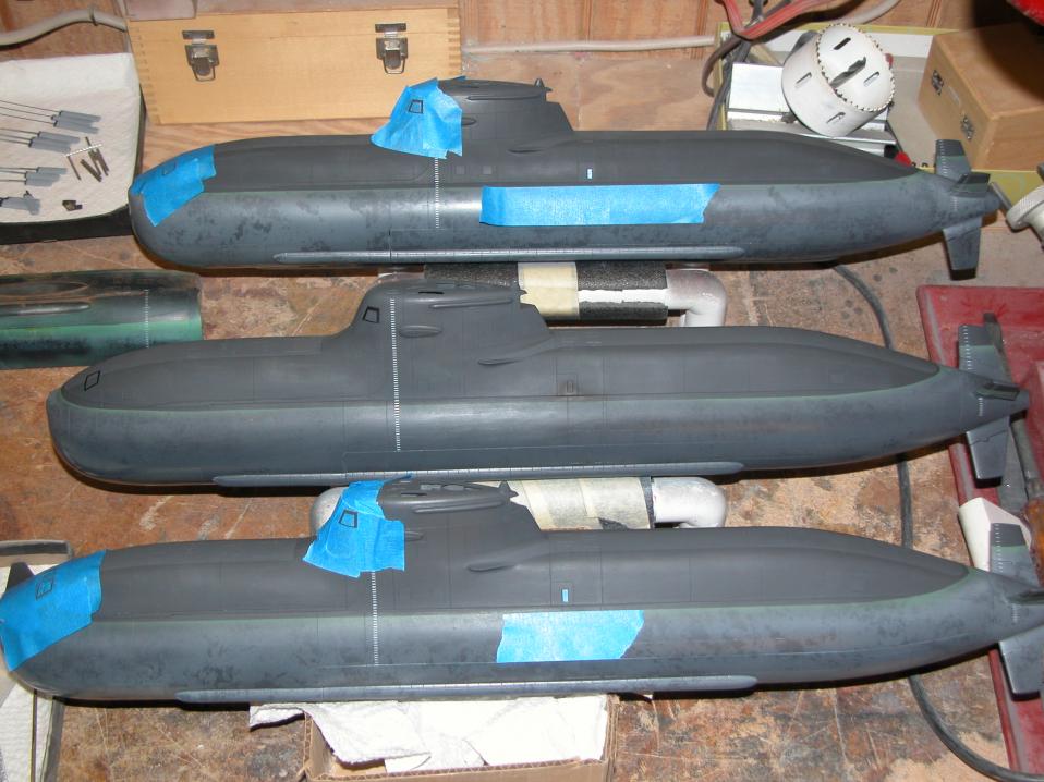 I had previously painted on the deck non-skid and draft markings to the sides of the sail and to the inboard and outboard faces of the upper set of stern control surfaces. I then mixed up and sprayed the models with a heavy coat of well flattened clear-coat.