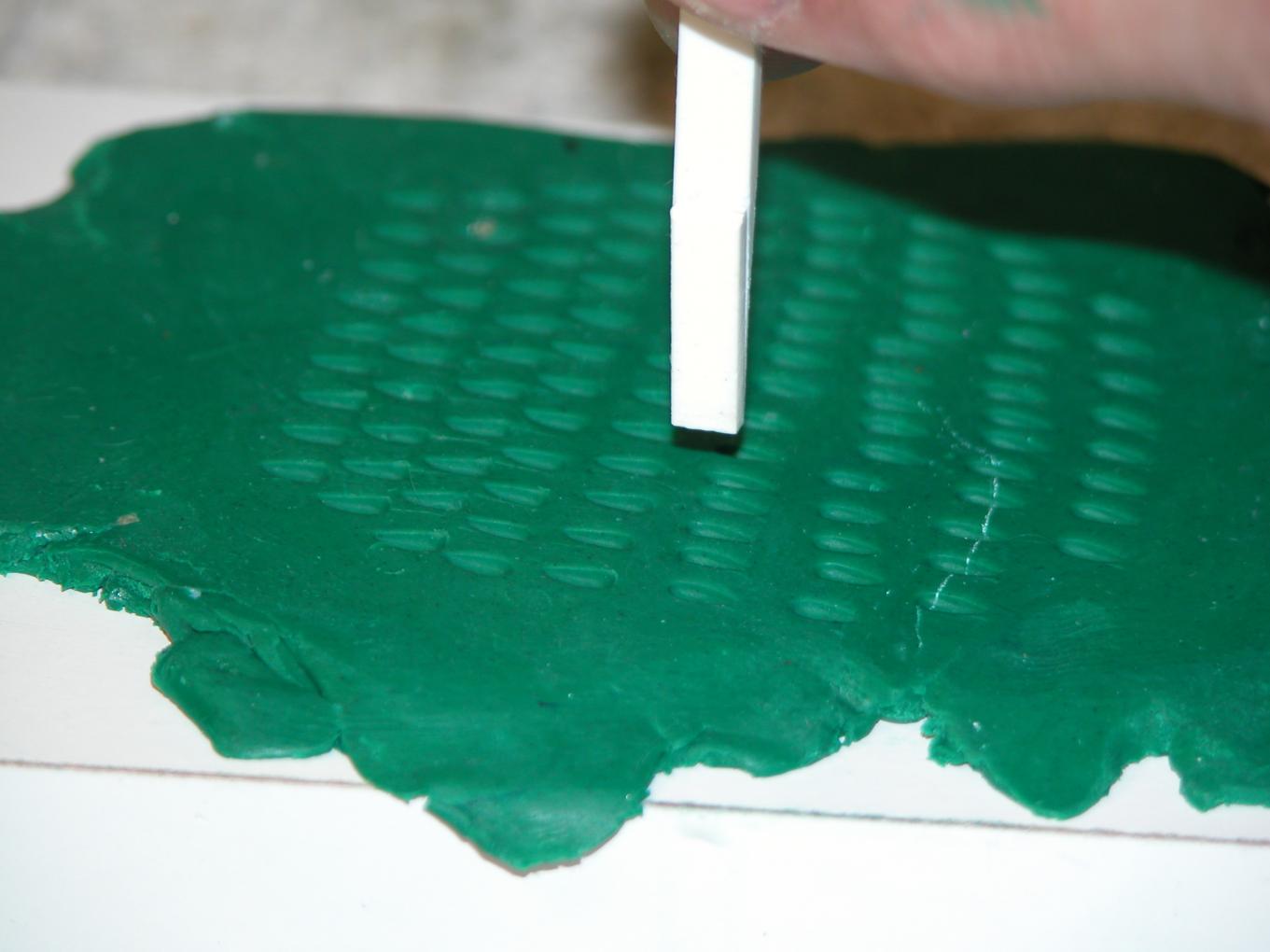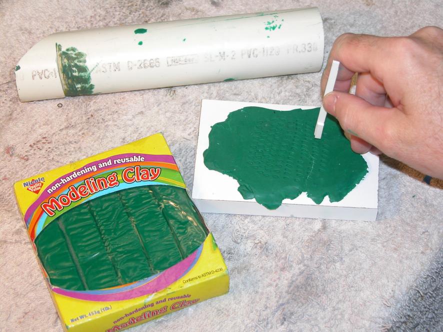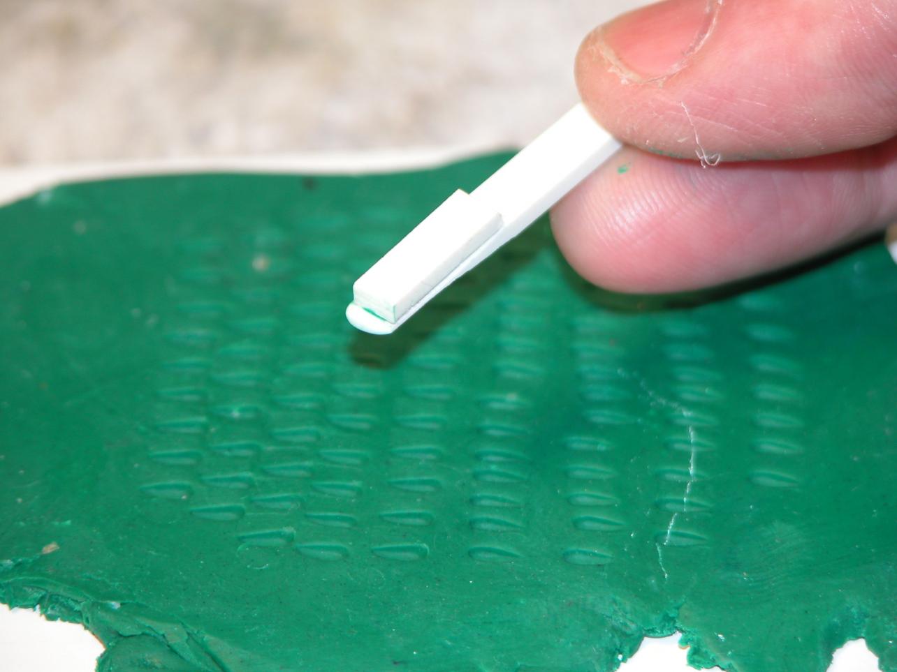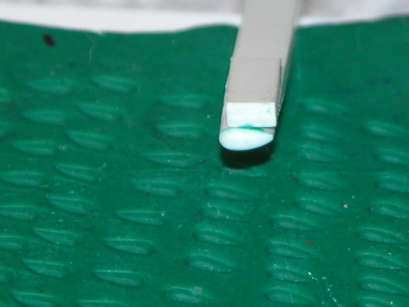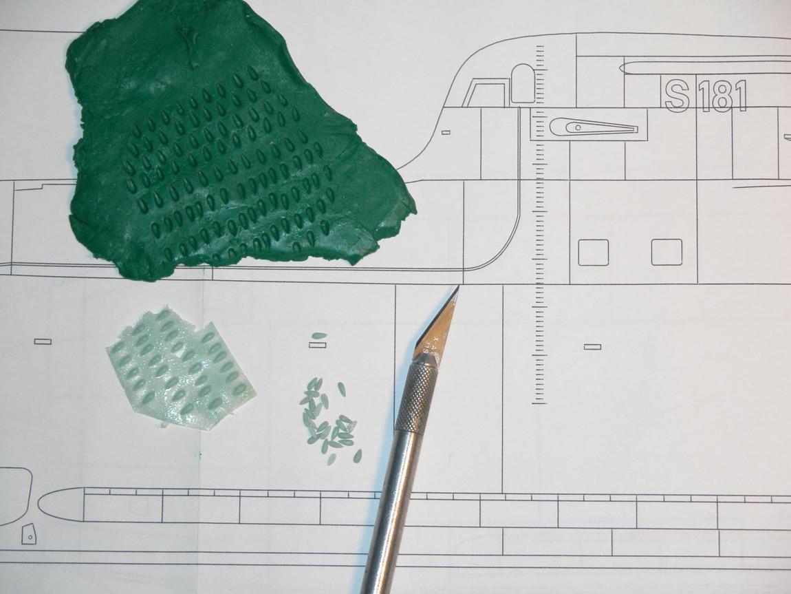 Here is a shot of the in-mass grouping of the Type-212 tear-drop shaped zincs. The thin connecting film is an artifact of the casting process. Removing the individual zincs from this fret was done by sliding the fret over a piece of #400 sandpaper till the film was worn away, leaving the individual zinc parts, ready for final sanding, priming, and installation to the Type-212's hull. The Mold was formed from oil-clay that had been rolled out flat on a moldboard and the tear-drop cavities formed with a piece of plastic square-section rod that had one end cut and sanded to the desired shape. To one side of this form I glued a depth-stop -- it's job to insure that all cavities pressed into the clay were of uniform depth.