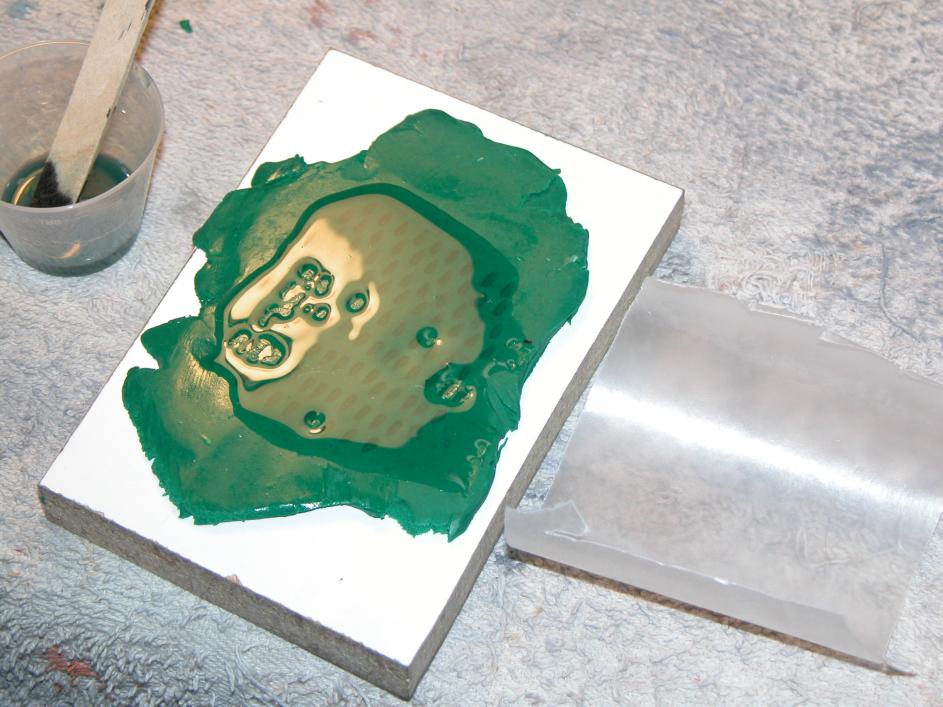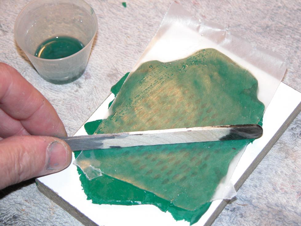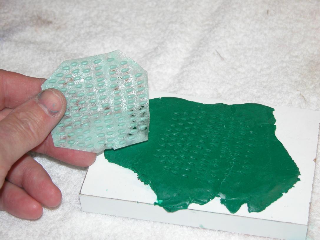 Once all the cavities had been pushed into the clay, I sprayed on some Mann 200 silicon mold-release spray; mixed up a small amount of casting resin, poured it over the clay; then laid down a piece of wax-paper. Capillary action pulled the wax-paper down tight onto the surface of the clay, minimizing the thickness of the resin film that formed over what would become the base of the little zinc parts. Once cured the cast fret of zincs was pulled away from the clay, dunked in a container of lacquer thinner and scrubbed with a stiff brush to get rid of any clinging mold-release.