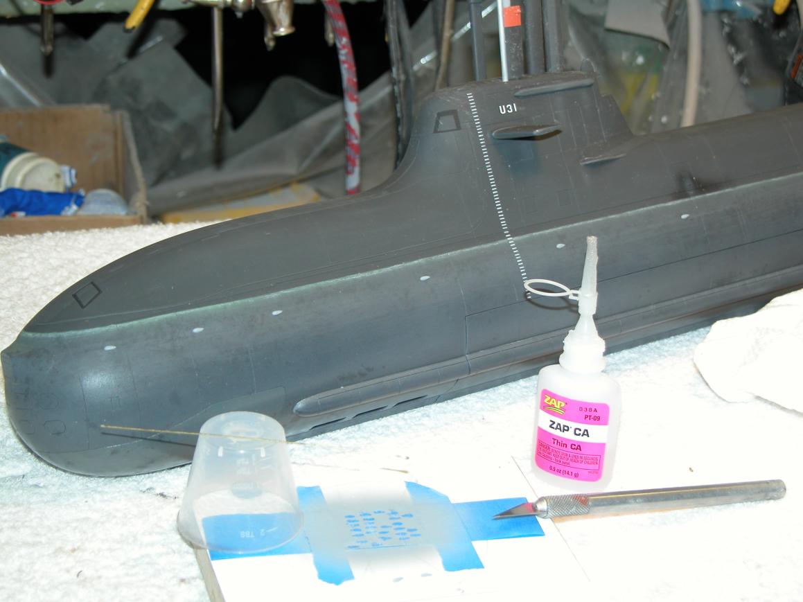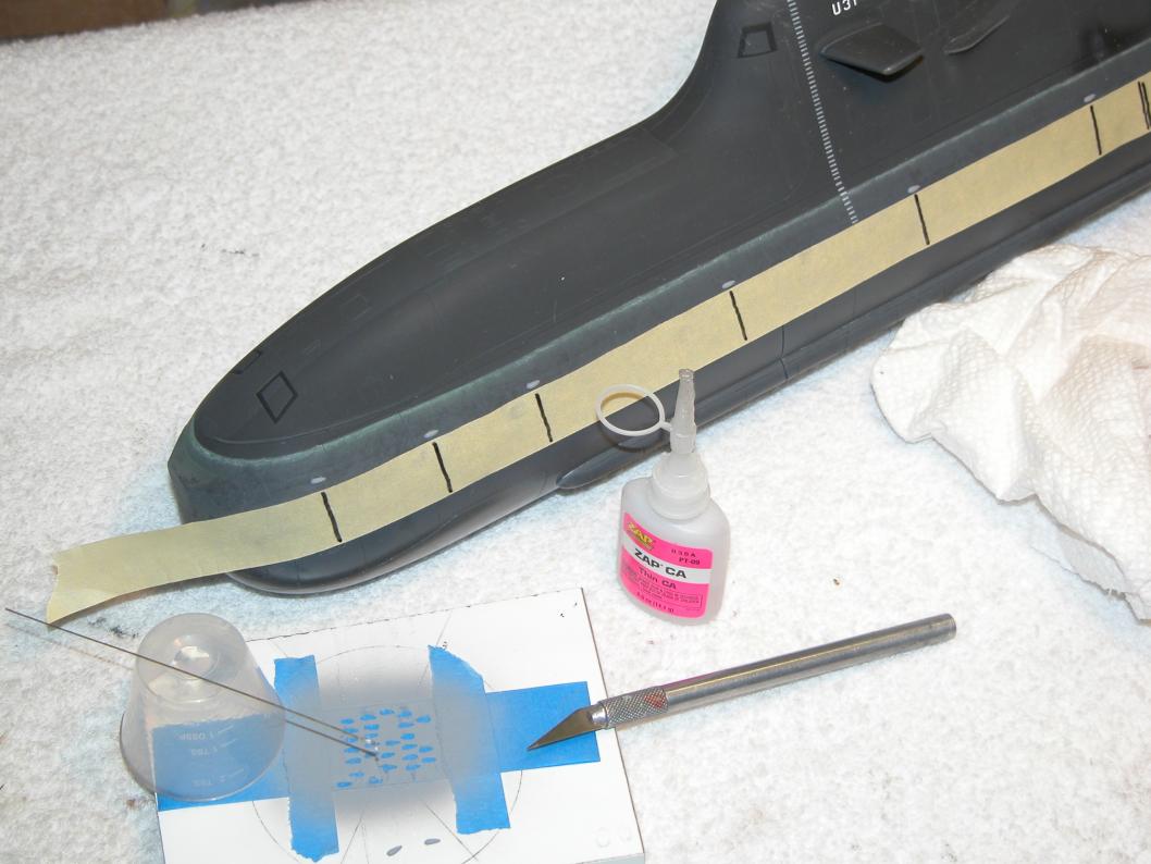 Each zinc was painted primer gray. Then, using the drawing of the Type-212, I plotted the longitudinal location of each zincs onto a length of masking tape. Using that tape as a guide I CA'ed each zinc in place on the hull