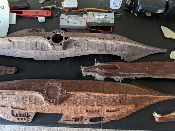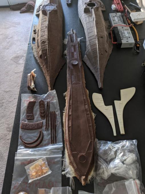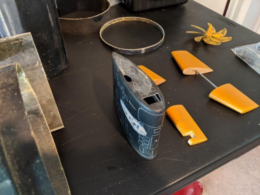 The Stern was complete but had suffered damage yet completely restored professionally, just need to open up MBT flood holes there. Prop bushing in place. Midsection is opened as shown for access and contains a DeBoer Ballast tank. The get a DeBoer Gas tank and 6V Cippard valve as well. There are no stern planes and one stern plane is missing the fwd stabilizer. They can reach out to Lee Upshaw of Scale Shipyard or cast themselves. That's a D & E prop sized for 3/16". I also added a bow plane from the other should they want a 688I, they can cast a 2nd."