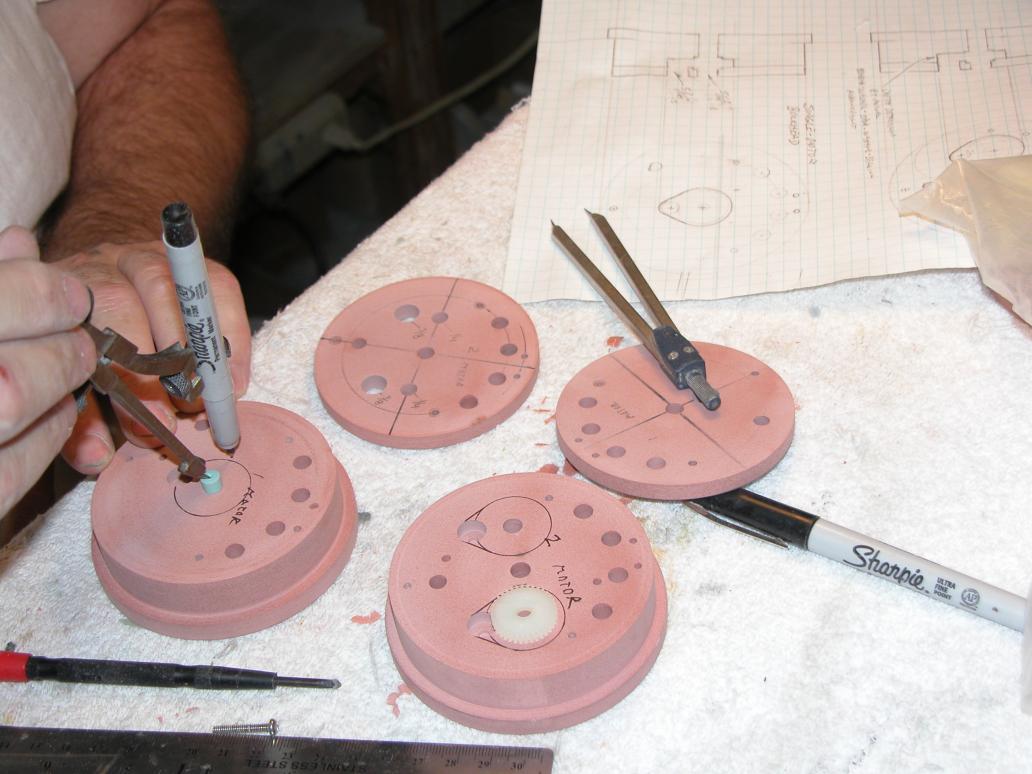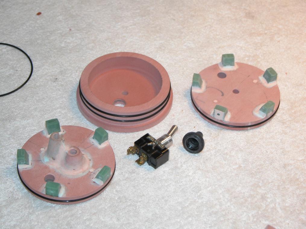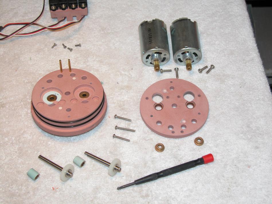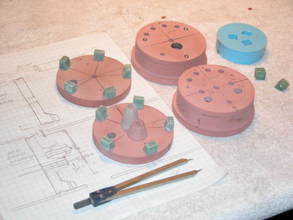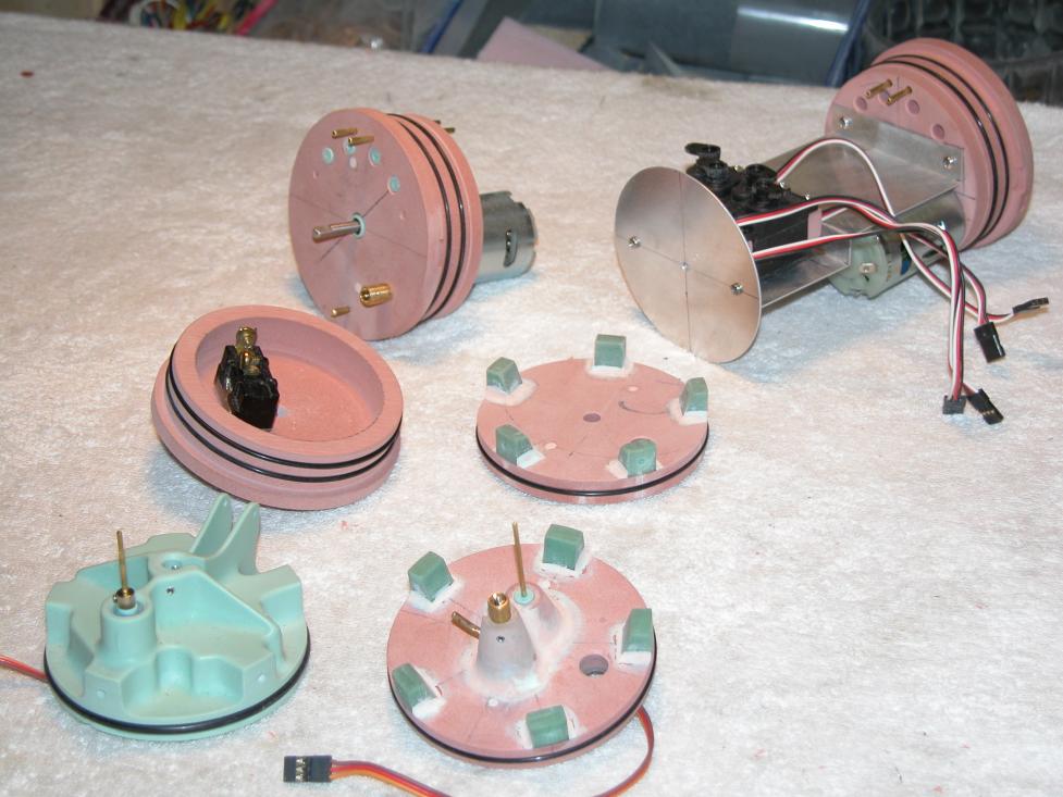 By the way, I'm finishing up tooling for an improved (something had to change in the course of 20 years of production, improvements and sales) 3.5" SubDriver, pictures below. The new arrangement -- in no small part occurring do to your non-stop badgering and threats of violence -- features a single cylinder arrangement as found in our other SubDriver's: A forward dry-space for the battery and mission switch, a central ballast tank (with centrally running conduit tube), and an after dry space with attached motor bulkhead. These will be offered as kits so the end-user can adjust compartment lengths to suite his specific needs. Presented are the masters for a single motor, single-shaft and a dual motor, dual-shaft motor bulkhead. Note that I validate all mechanical and structural connections and function on the production masters -- if it works as a master, then I'm assured that the production cast resin parts will also work. This practice avoids expensive 'modifications' later.
