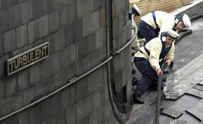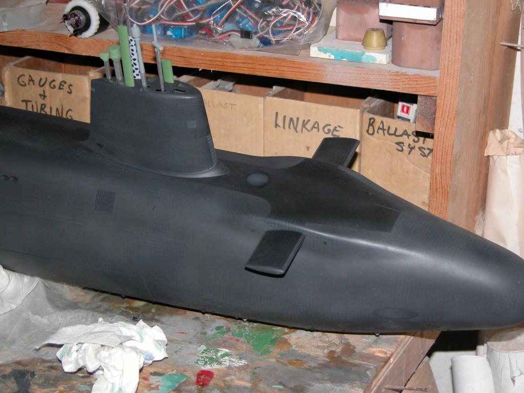 The tiles are basically glued with a thick bitumen adhesive, the tiles are applied in several layers using this material. Machinery and engineering spaces would have more layers of tiles, this can be seen when looking at photographs of the boats on roll out. The tiles are infact really untidy to look as if one studies the photographs available for which I have in the thousands, one can see. The paint is however used to seal and protect the tiles from the elements, but we all know that tiles do fall off. The first photo is of Repulse newly painted with bitumen paint at Faslane prior to sailing orders and the other a well known photo not taken by me of Turbs with missing tiles on upper casing. One point to add Torbay did however sail Devonport painted blue and not black for a deployment in the Med