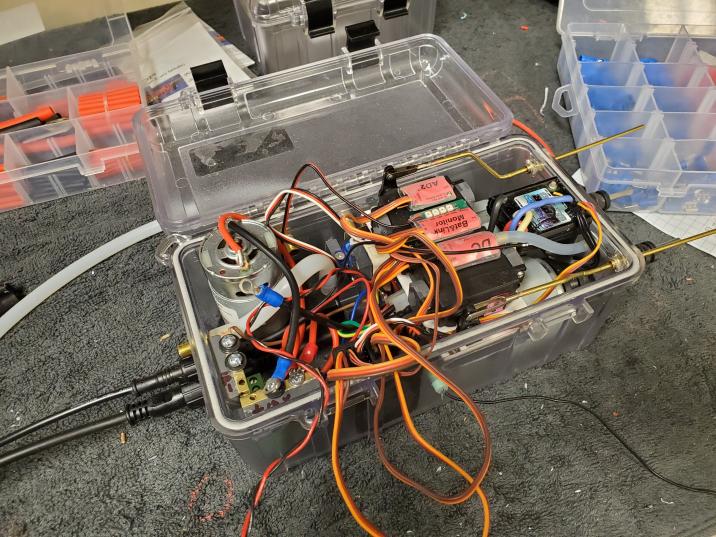 Work continues on the big German Type VII for Marcel up in Quebec. Inspired by Ed's writeup on his Skipjack, and proven with my MSS experiment (click here for the write up on that one if you haven't already seen it) I am working on the rear control compartment. This one houses the twin drive motors, ESC, rudder and rear plane servos, Depth Controller, Battery and Link Monitor, Pitch Controller, ballast air pump, equalization valve, emergency blow switch and HP15 electronic switch for ballast.