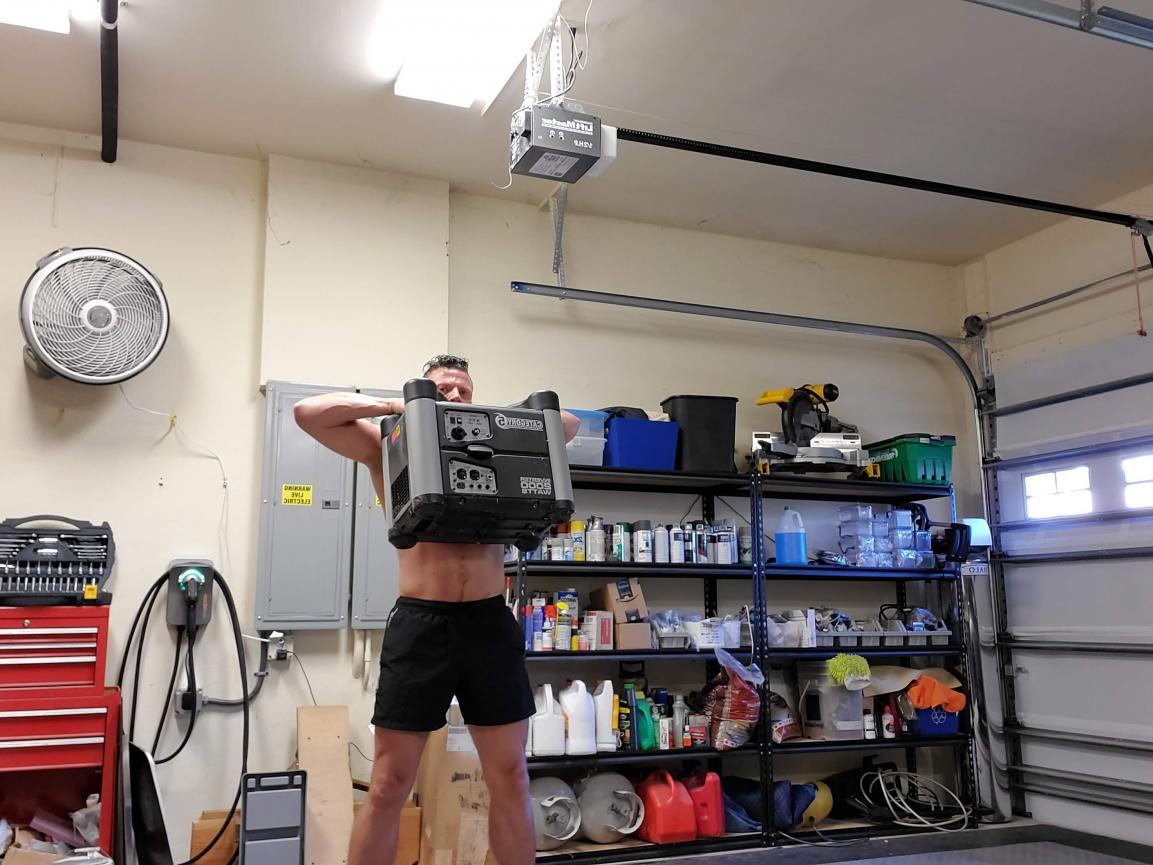 My daily workout regime is slaughtered. I usually take CrossFit-inspired classes at my local gym. Of course, now we're forced to do it all via online workouts. I've got no weights, so I make do with what is laying around. Logan and I are trying to do daily exercise. This was part of yesterday's workout with me using our little backup generator for weight: