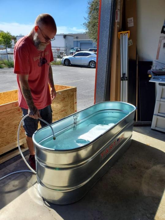 The Drydocks got a new test facility! Or at least a new test tank. Now that I'm in my shop and not working from the house, I needed a better way to quickly test cylinders and boat trim. This is a galvanized livestock tank measuring 2ft x 6ft. We keep it filled and put a few drops of bleach in every week to keep it sparkling. This has really cut down on wasted time traveling back and forth to and from my home pool. We still do the maiden voyage of builds at my local pond, but this is a life-saver!