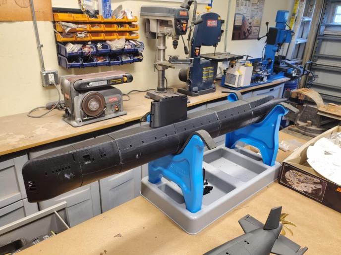 Nearing completion of printing of the 1/250 LXG sub. Assembly is going well and there is sufficient room in the stern for electronics and drive components if I get creative. One of the first printing flubs on my Dremel printer in a loooong time. It wasn't the printer's fault, but an error in the file that I discovered post-mortem. I elected to continue the print despite the failure of the upper hull. Lost some filament, but saved about 10hrs of print time doing so. Final stern hull section is on the printer now, then it's just control surfaces and conning tower and she'll be ready for final assembly.