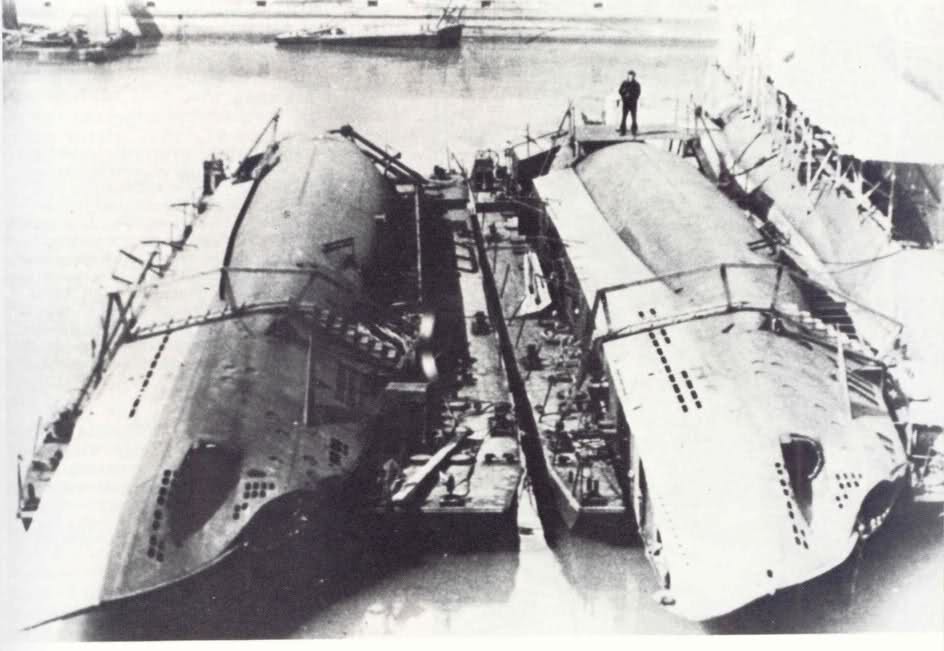 the RDFs all retracted but in different places. Check out U 10 next to 18 and 13 and the boat behind it> their antenna are mounted forward on the step of the tower. The ones that were inside the tower were recessed into the bulkhead. Heres a picture of U 23 (left)on its side on a barge on the way to Istanbul. Note the limberholes wernt changed as is the boat on the right either. The pic of the boat with the Black Sea cammo up top is mis captioned as 18. It is U23, Note no aft flakClick image for larger version