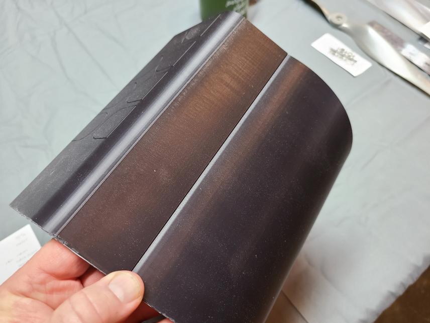 I spent about five minutes sanding micro-blobs off a couple of parts. The layer lines from my printer are barely visible for properly oriented parts, but a thin coating of XTC-3D leaves the rivet detail visible. Total print time was less than 72 hours. My next iteration of it will have the two top and bottom sections (11" when joined) printed as single parts.