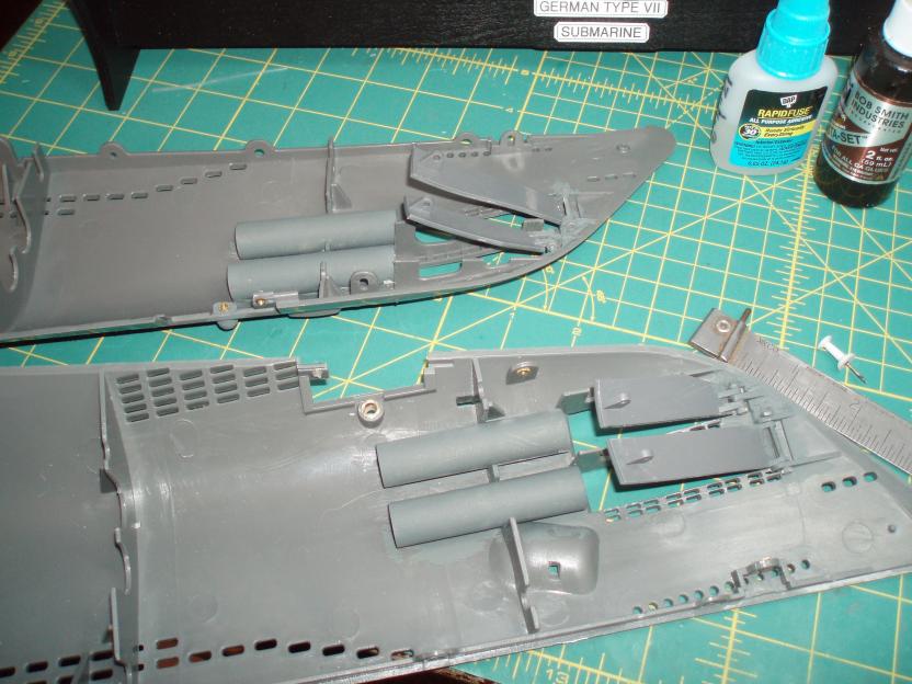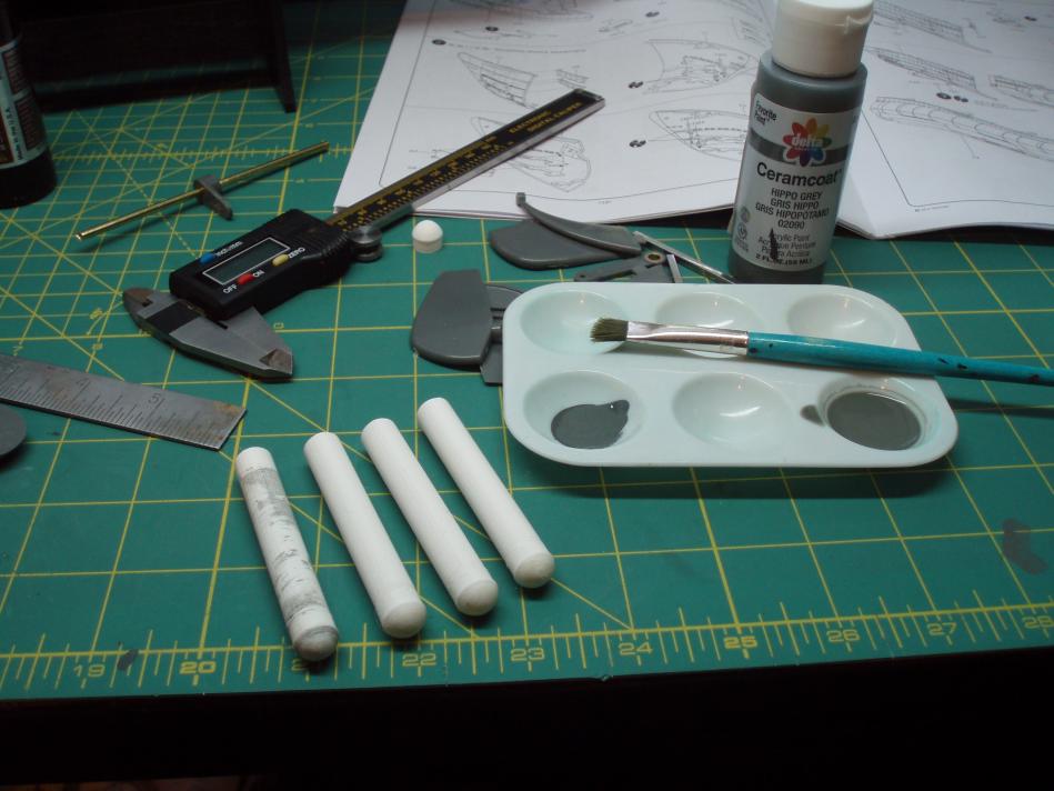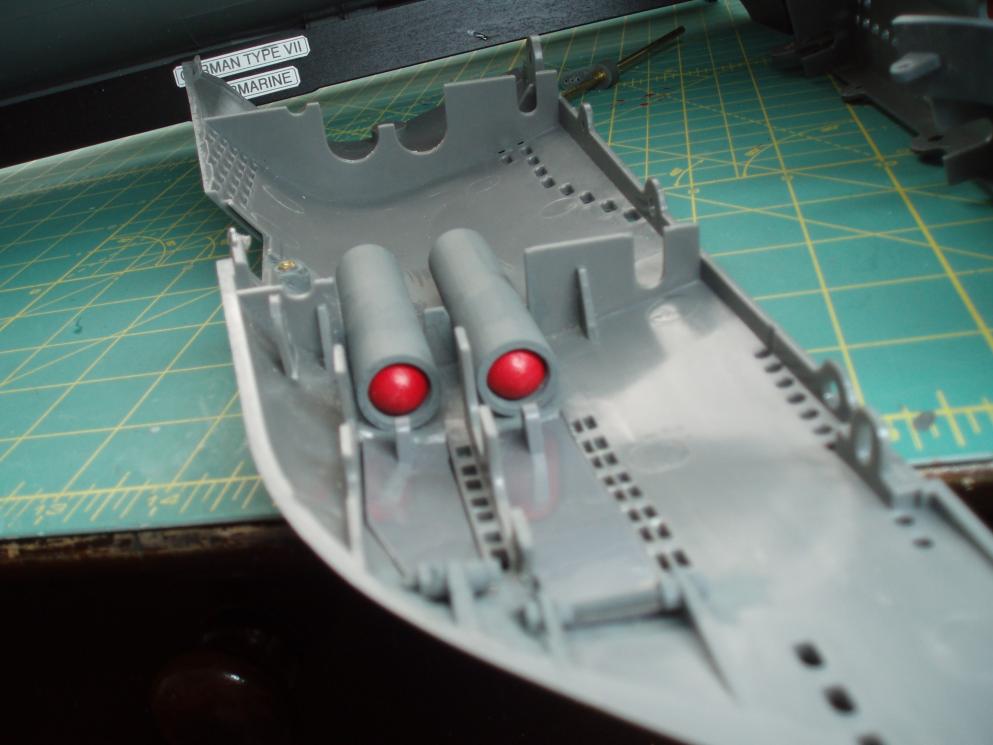 I 3D printed the simulated torpedo's, and then slapped on a little red acrylic paint on the heads and the CA'd to the tubes. Touched it all up with grey acrylic paint At this point I am going to fabricate system to open and close the outer doors. Bob Martin submitted some drawings as to how he fabricated the linkages to achieve this function. Not sure yet! I may just add an additional servo to operate the outer doors!!!